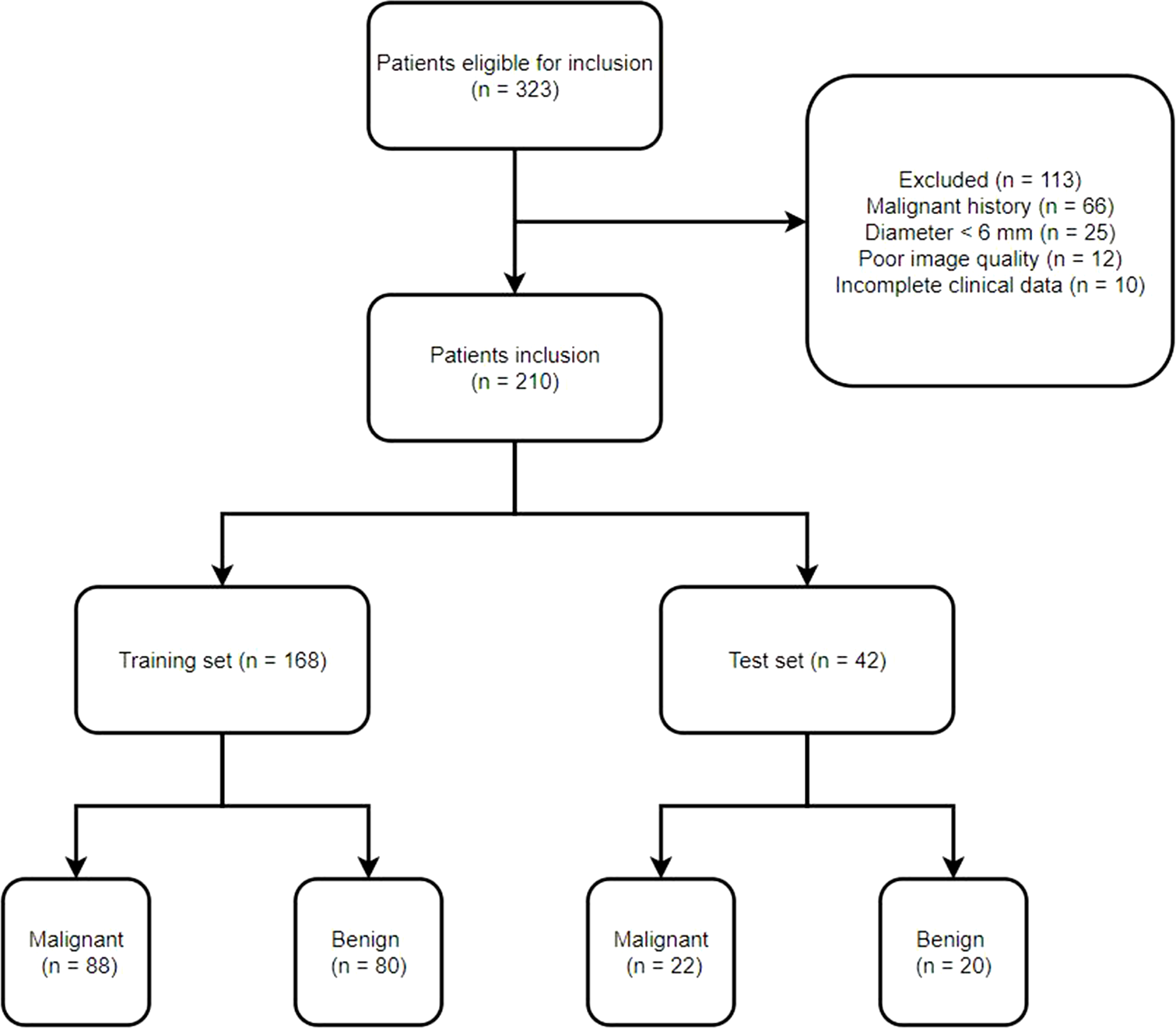 This study enrolled small SPN patients consecutively from January 2019 to November 2021. The inclusion criteria included patients who indicated: (i) small SPNs ≤ 20 mm, (ii) a confirmed pathological SPN diagnosis after surgical resection, and (iii) a < 2-week interval between SPN detection and surgical resection. Patients were excluded if they had: (i) poor image quality; (ii) a history of malignancy, (iii) SPNs < 6 mm in diameter, or (iv) incomplete clinical data. Eligible patients were randomly assigned to training and testing cohorts at an 8:2 ratio.