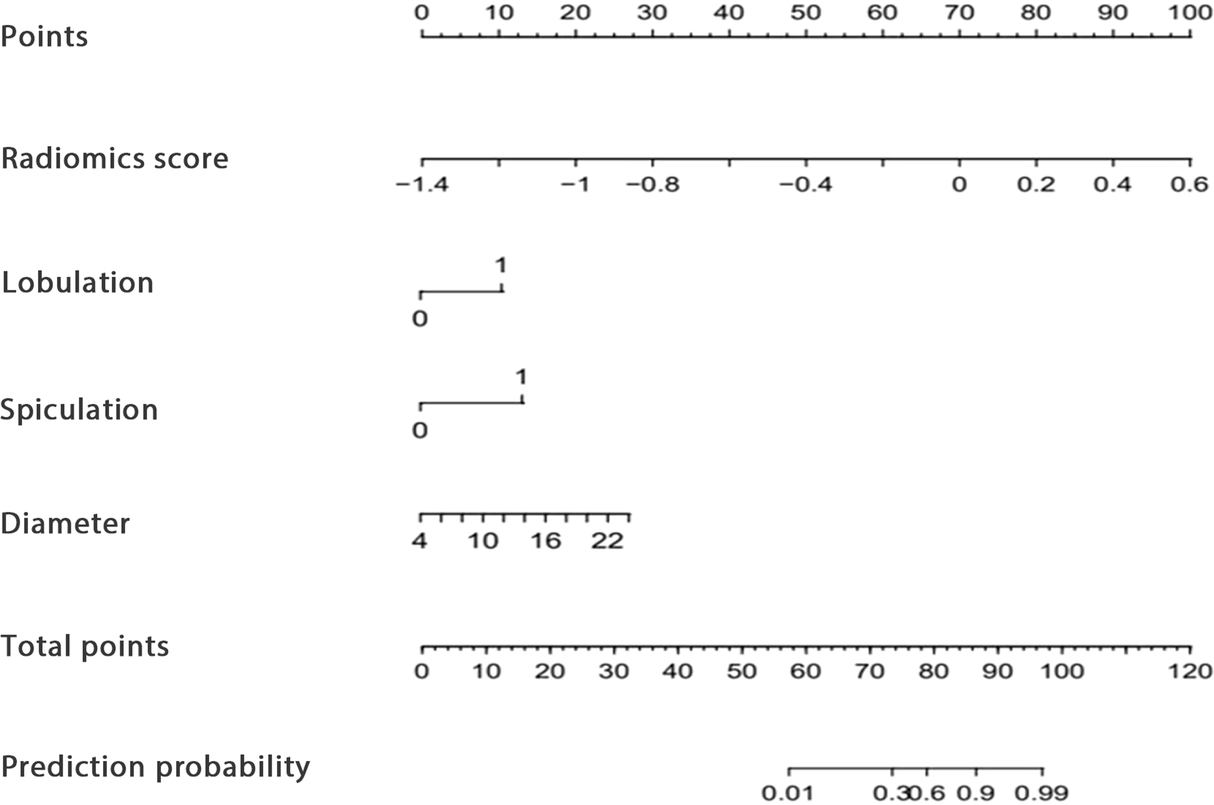 Here, a CT radiomics-based model was developed that could distinguish between benign and malignant small SPNs. This model was based on a combination of the radiomics scores and the established clinical model. The model showed an AUC value higher than that of the clinical model in the training (0.957 vs. 0.853, P = 0.021) and testing (0.943 vs. 0.816, P < 0.001) cohorts. These data validate that the radiomics score to significantly improves diagnostic performance relative to that associated with traditional clinical and radiological findings. The resultant nomogram can generate a direct predictive score for each small SPN, with this score corresponding to a predicted probability that can aid in clinical decision-making efforts.
