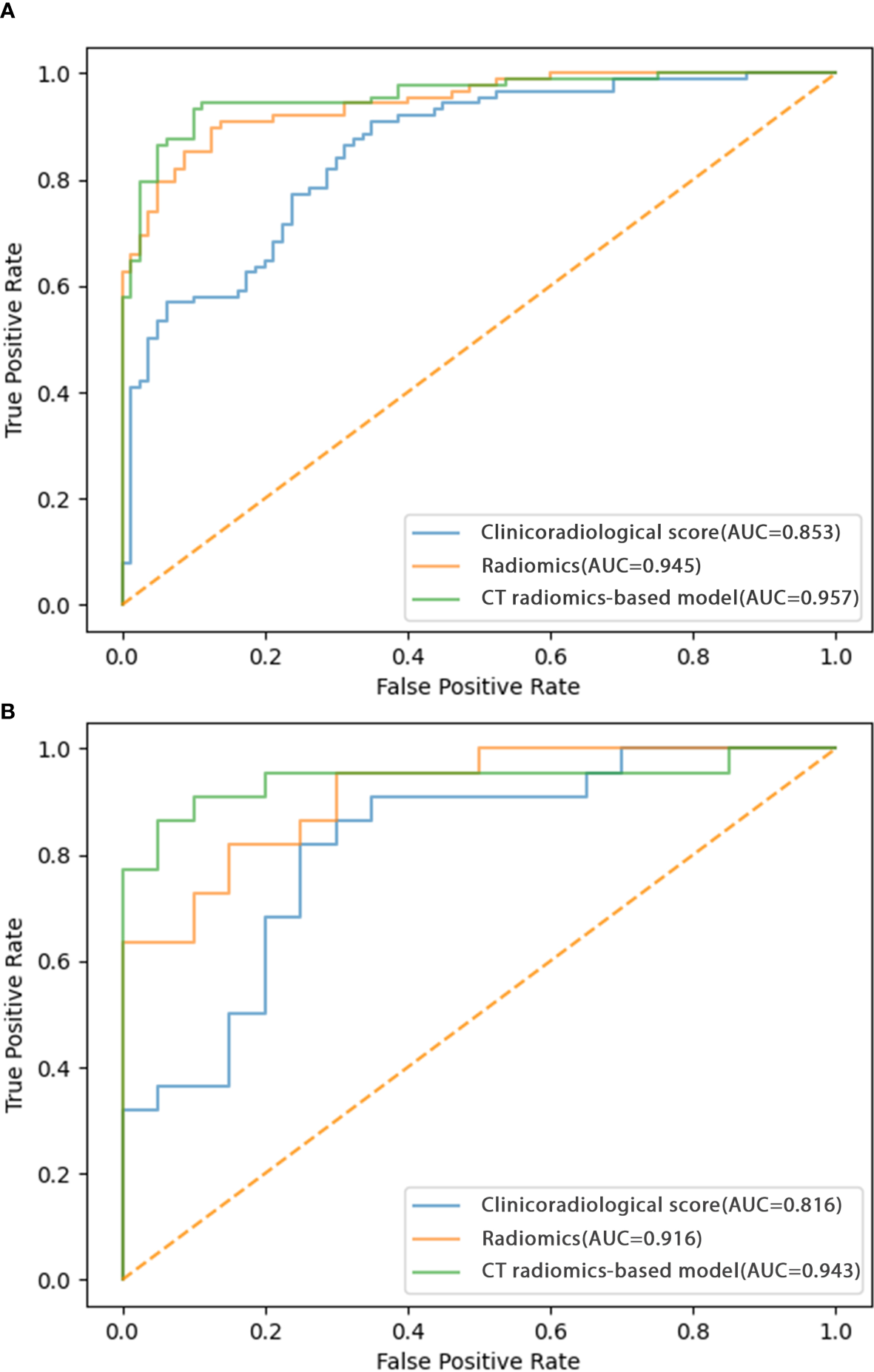 The identified clinicoradiological factors and radiomics score were used to establish a predictive model with the following formula: X = -6.773 + 12.0705×radiomics score+2.5313×lobulation (present: 1; no present: 0)+3.1761×spiculation (present: 1; no present: 0)+0.3253×diameter. A nomogram was also developed with this CT radiomics-based model (Figure 2). Furthermore, individual clinicoradiological and radiomics score models were also developed. Sensitivity, specificity, accuracy, and AUC measurements for these models are presented in Table 3. AUC values for the CT radiomics-based model, CT radiomics score, and clinicoradiological score were 0.957, 0.945, and 0.853 (Figure 3A). Moreover, the AUC values of the CT radiomics-based model were significantly higher those for both CT radiomics scores (P = 0.035) and clinicoradiological scores (P = 0.021).