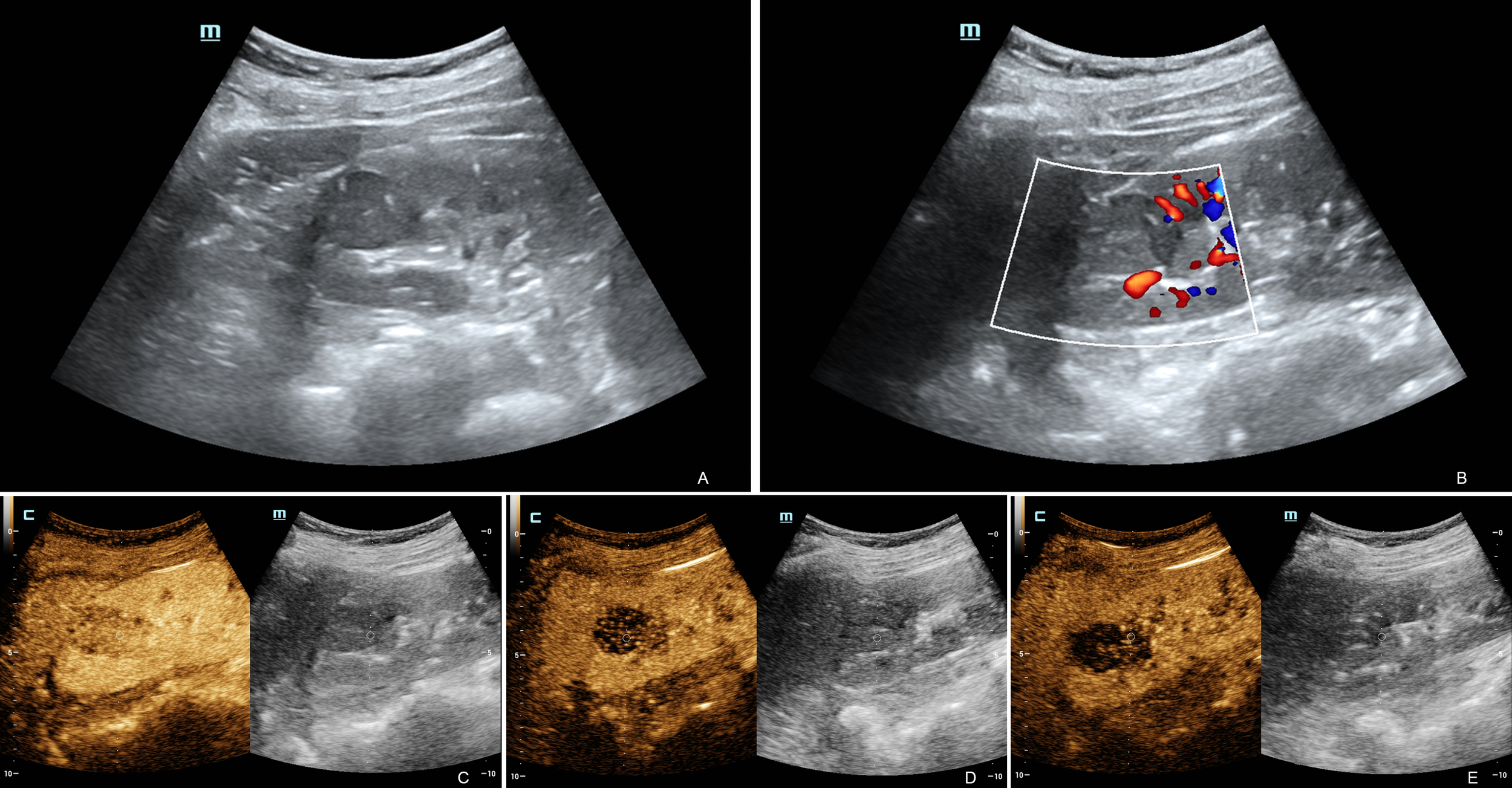 Ultrasound and contrast-enhanced ultrasound images of MTSCC. Ultrasound image showing a homogenous mass in the upper pole of the right kidney (A). Color Doppler ultrasound showed no obvious blood flow in the mass, but there was some around it (B). CEUS showed heterogeneous mild enhancement in the MTSCC lesion compared to the adjacent renal parenchyma in the cortical phase (C). In the medullary phase (D), the washout of the tumors was more simultaneous than that of the adjacent renal parenchyma. The lesion showed hypoenhancement during the delayed phase (E). These performances indicated hypovascular renal tumors.