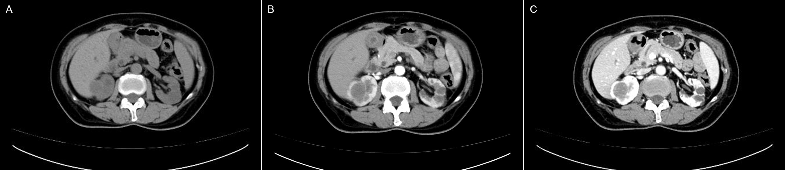 Computed tomography and contrast-enhanced computed tomography images of MTSCC: (A) CT plain scans showed a homogeneous slightly low density mass in the right kidney. Enhanced CT showed homogeneous mild delayed enhancement in arterial (B) and venous phases (C).