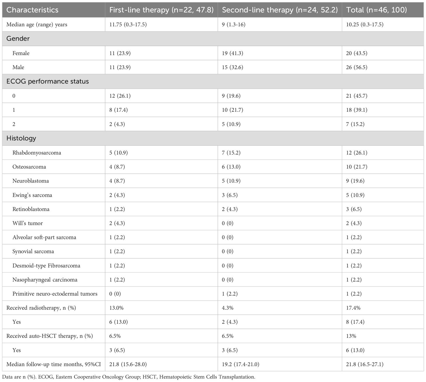 A total of 46 patients were screened between November 13, 2019, and October 11, 2023. The enrolled patients were divided into two groups: 22 (47.8%) received first-line therapy, and 24 (52.2%) received second-line therapy before anlotinib combined with sintilimab maintenance treatment. The baseline characteristics are presented in Table 1. The median age at anlotinib combined with sintilimab initiation was 10.25 (0.3–17.5) years; 26 (56.6%) patients were male, and 20 (43.4%) were female. The histopathology types included rhabdomyosarcoma (n = 12), osteosarcoma (n = 10), neuroblastoma (n = 9), Ewing’s sarcoma (n = 5), synovial sarcoma (n = 1), alveolar soft part sarcoma (n = 1), Wilms’ tumor (n = 2), retinoblastoma (n = 3), desmoid-type fibromatosis (n = 1), nasopharyngeal carcinoma (n = 1), and primitive neuroectodermal tumors (n = 1). All patients had an acceptable ECOG performance status score (≤2). Before receiving maintenance therapy, all patients had received different treatments, including surgery, several lines of chemotherapy, radiotherapy, or hematopoietic stem cell transplantation (HSCT). Among all the patients, 6 (13.0%) received radiotherapy and 2 (4.3%) received HSCT in the first-line therapy group, and 3 (6.5%) received radiotherapy and 3 (6.5%) received HSCT in the second-line therapy group.