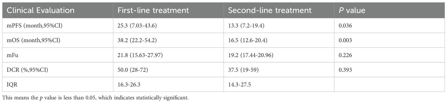 Results: After a median follow-up of 21.8 months (95% CI, 16.5–27.1), the mPFS was 25.3 months (95% CI, 7.0–43.6) in the first-line treatment group and 13.3 months (95% CI, 7.2–19.4) in the second-line treatment group. The mOS in the first-line and second-line treatment groups was 38.2 months (95% CI, 22.2–54.1) and 16.5 months (95% CI, 12.6–20.4), respectively. The DCR was 50.0% (11/22; 95% CI, 28–72) in the first-line group and 37.5% (9/24; 95% CI, 19–59) in the second-line group. Most treatment-related adverse events were grade 1–2. The most common grade 3–4 adverse event was anemia (2/46, 4.3%).