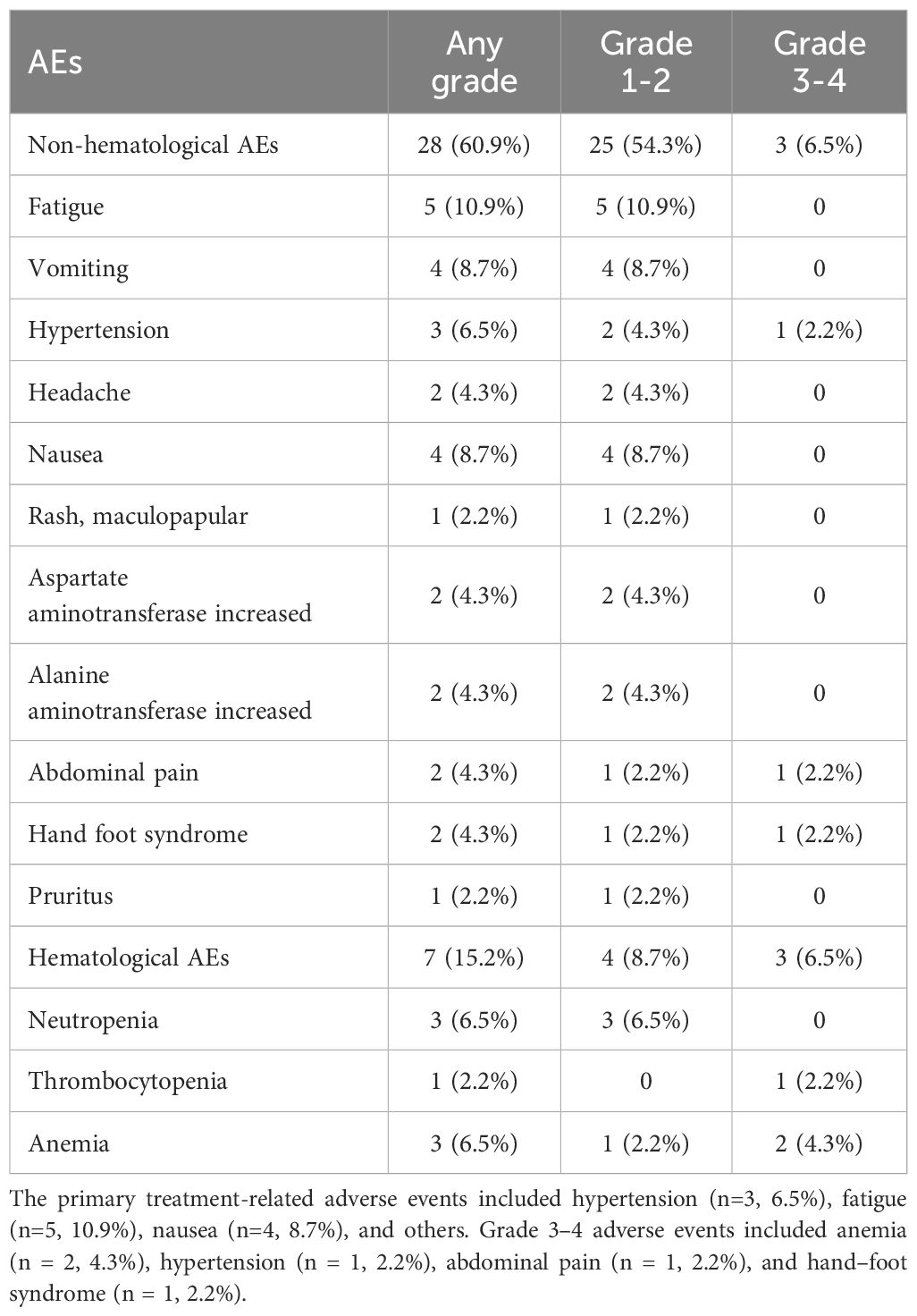 The majority of adverse events related to maintenance treatment with anlotinib combined with sintilimab were mild or moderate in severity. As shown in Table 3, the incidence of adverse events was 76% (35/46); vomiting (8.7%), fatigue (10.9%), and nausea (8.7%) were the most common adverse events. The incidence of grade 3 or 4 adverse events was 13.0% (6/46), which included both non-hematological and hematological AEs. Among the non-hematological AEs, grade 3 hypertension (n = 1), grade 3 abdominal pain (n = 1), and grade 3 hand–foot syndrome (n = 1) were observed. Among the patients who developed grade 3–4 hematological adverse events, one patient had received HSCT, and the remaining patients had received radiotherapy. This suggests that anemia and thrombocytopenia may be associated with high-dose chemotherapy and radiation therapy.