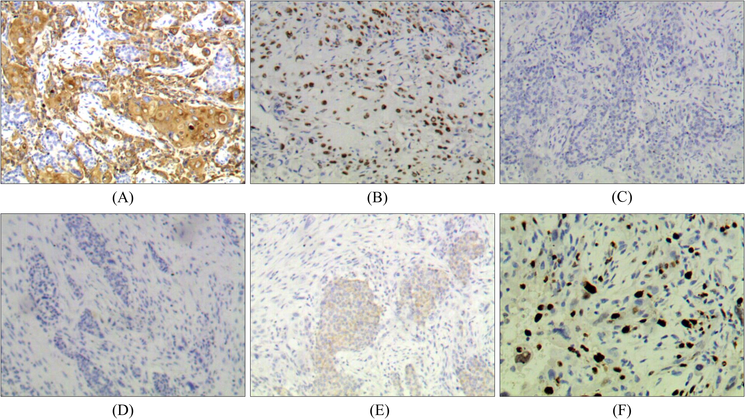 Figure 2. Immunohistochemistry of breast MEC: (A) Positive for CK5/6 (×100). (B) Positive for p63 (×100). (C) Negative for ER (×100). (D) Negative for PR (×100). (E) Negative for HER-2 (×100). (F) Positive for Ki67 (+, 30%).