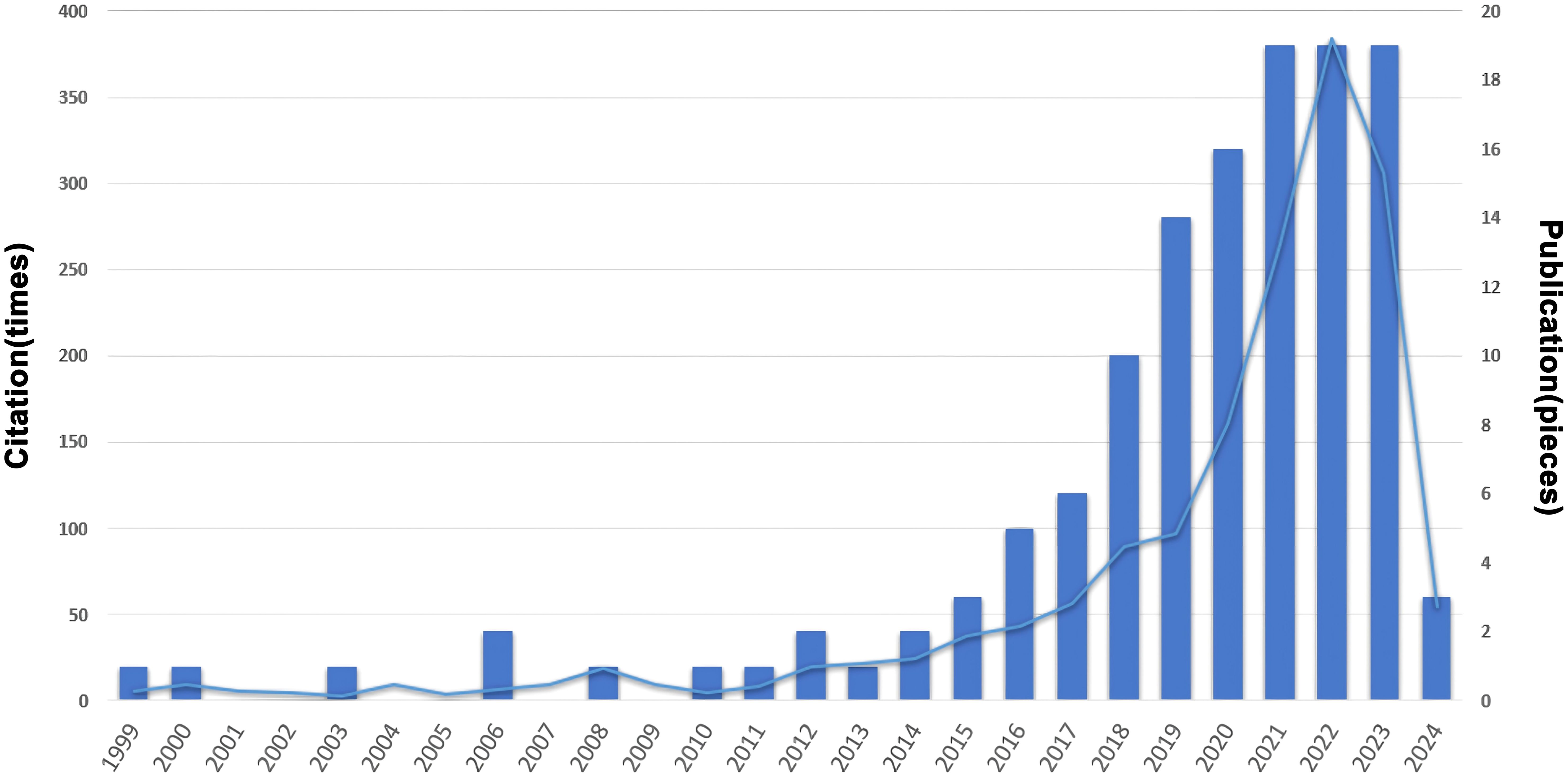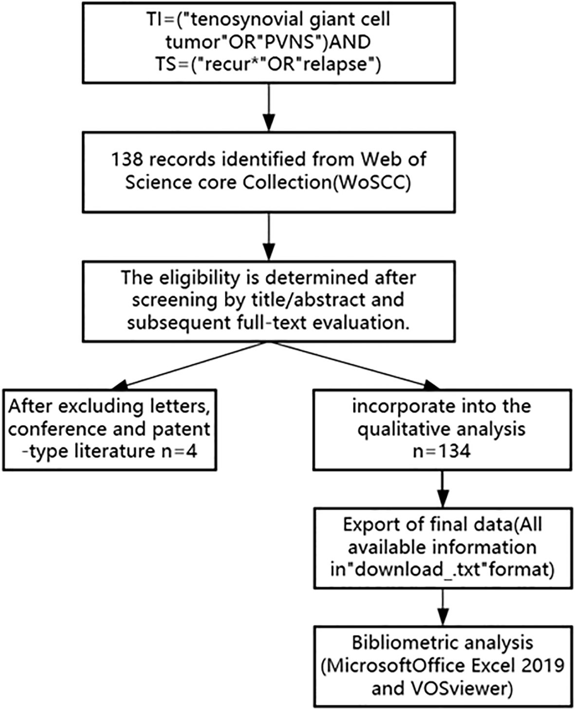 The Web of Science (WoS) is a globally recognized research platform, covering vast information resources across science, arts, and humanities, and is widely trusted by international publishers as an independent and authoritative citation database. To ensure the representativeness and accessibility of data, all publications related to recurrence of TGCT were retrieved from the WoS database. It should be noted that TGCT has long been referred to by most orthopedic surgeons as PVNS. Although the World Health Organization revised the nomenclature over a decade ago, a substantial portion of the literature continues to use the term PVNS. To minimize retrieval bias, both “TGCT” and “PVNS” were included as search keywords. Specifically, the search was conducted in the title field using “tenosynovial giant cell tumor” OR “PVNS,” and in the topic field using “recur*” OR “relapse,” while literature types such as letters, conference papers, and patents were excluded.