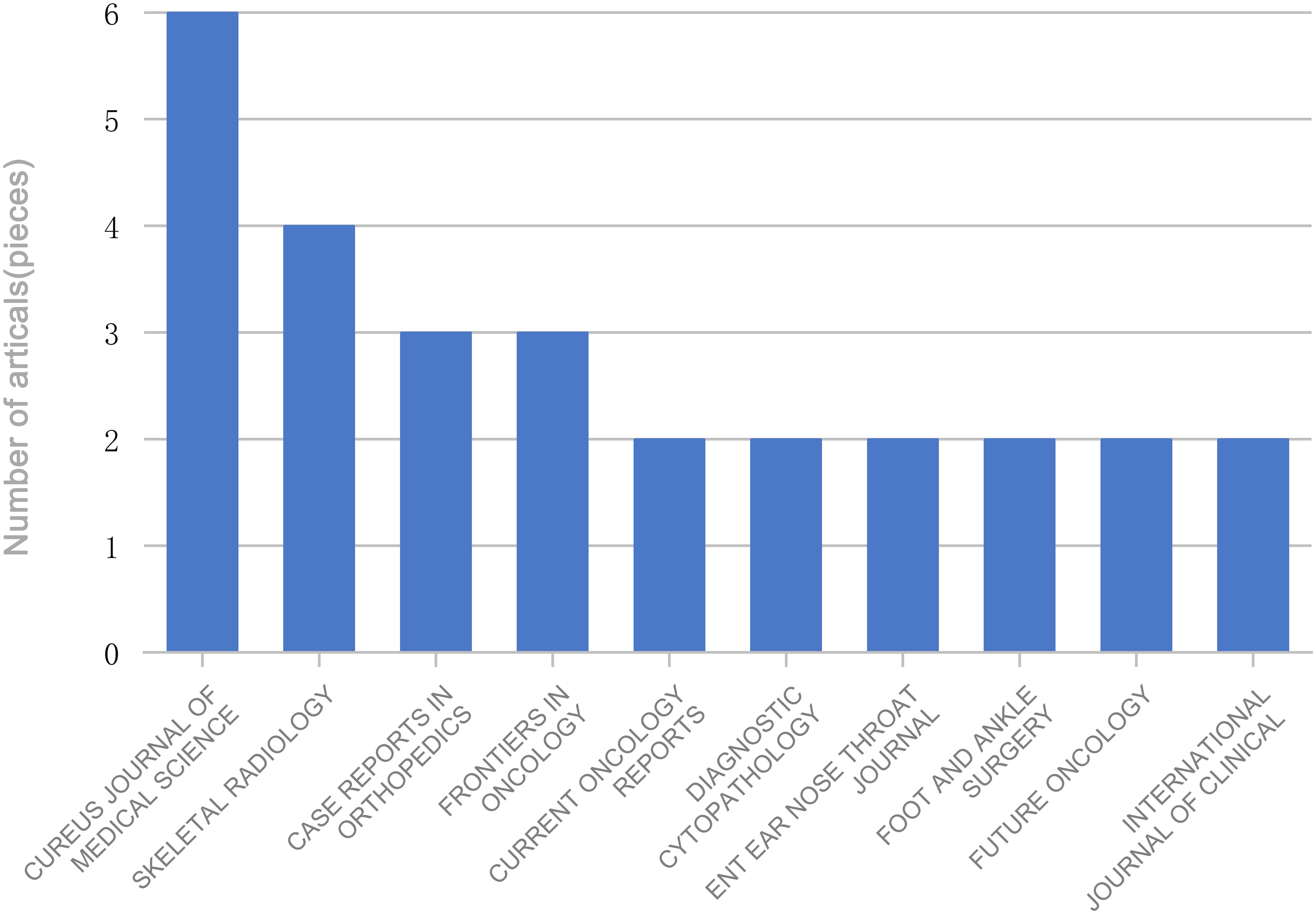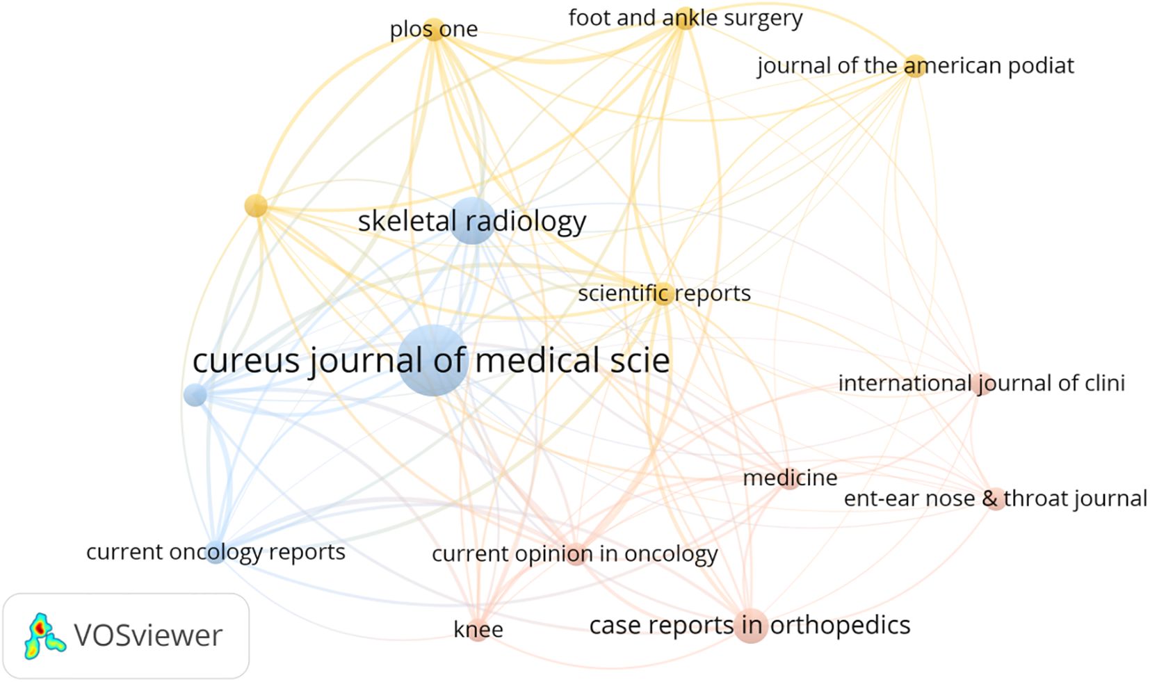 Our bibliometric analysis also revealed that Cureus Journal of Medical Science contributed the largest number of publications (6 of 134), followed by Skeletal Radiology (4), Case Reports in Orthopedics (3), and Frontiers in Oncology (3). These journals encompass both specialized orthopedic publishers and multidisciplinary platforms, and most TGCT recurrence studies were published in clinical journals, with relatively few reports in basic science outlets. This further highlights the predominance of clinical case analyses over mechanistic investigations. Notably, one of the publishers specializes in oncologic imaging, indicating ongoing efforts to explore the role of imaging in TGCT diagnosis, treatment planning, and prognosis. Among the included articles, 47 (35.1%) were case reports. Authors represented 238 distinct institutions, and thematic classification suggests that, due to the rarity and low regional incidence of TGCT, most institutions report isolated cases rather than conduct systematic investigations.
