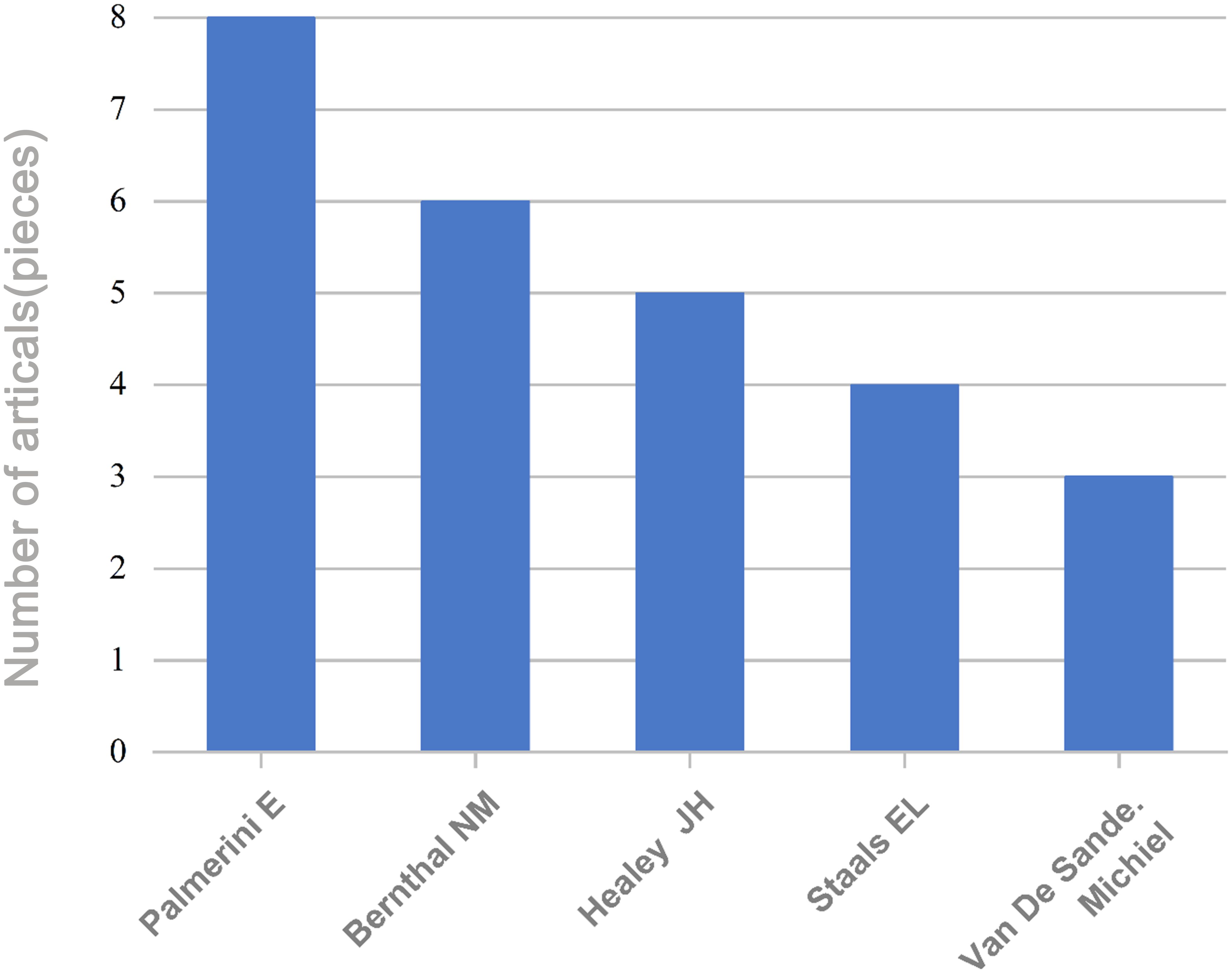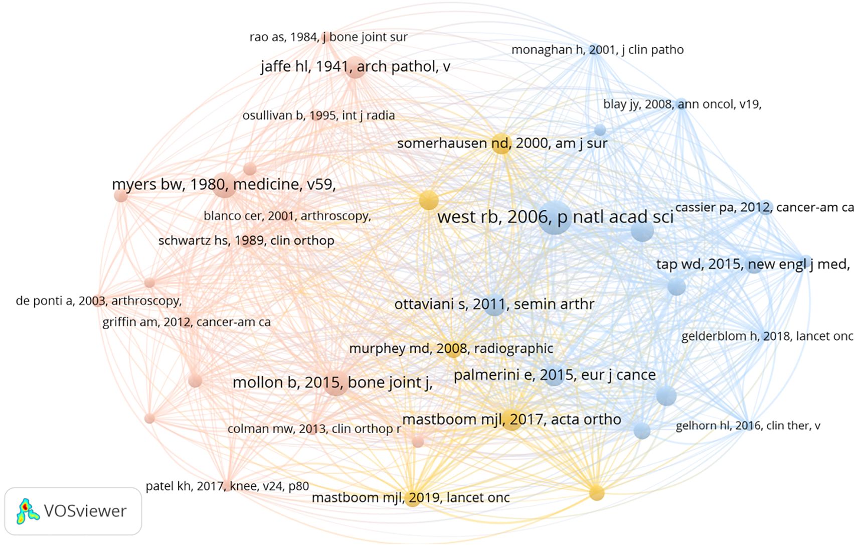 The 134 articles were published across 100 journals. Cureus Journal of Medical Science contributed the largest number, with six publications, followed by Skeletal Radiology, Case Reports in Orthopedics, and Frontiers in Oncology, which contributed four, three, and three articles, respectively (Figure 3). Co-authorship networks of journals are shown in Figure 4. A total of 710 authors contributed to these studies. Palmerini emerged as the most prolific author with eight publications, followed by Bernthal NM, Healey JH, Staals EL, and Van De Sande, contributing six, five, four, and three articles, respectively (Figure 5). The co-citation network among authors is illustrated in Figure 6. Further analysis of the collaboration network revealed that Palmerini has made substantial contributions to understanding TGCT incidence, treatment outcomes, and prognostic factors, with eight first-author publications. The most-cited paper by Palmerini, Tenosynovial Giant Cell Tumor/PVNS: Prognosis of 294 Patients Prior to the Era of Kinase Inhibitors (12), has been widely recognized. Current mainstream TGCT treatment involves surgical excision combined with targeted therapy and chemotherapy, offering improved control of tumor recurrence compared to conventional approaches. Collaborative studies between Staals and Palmerini have explored novel therapeutic strategies and conducted multicenter prospective prognostic analyses, significantly advancing the field. While Healey, Van De Sande, and Staals were not first authors in all publications, their collective 18 articles underscore substantial academic contributions.