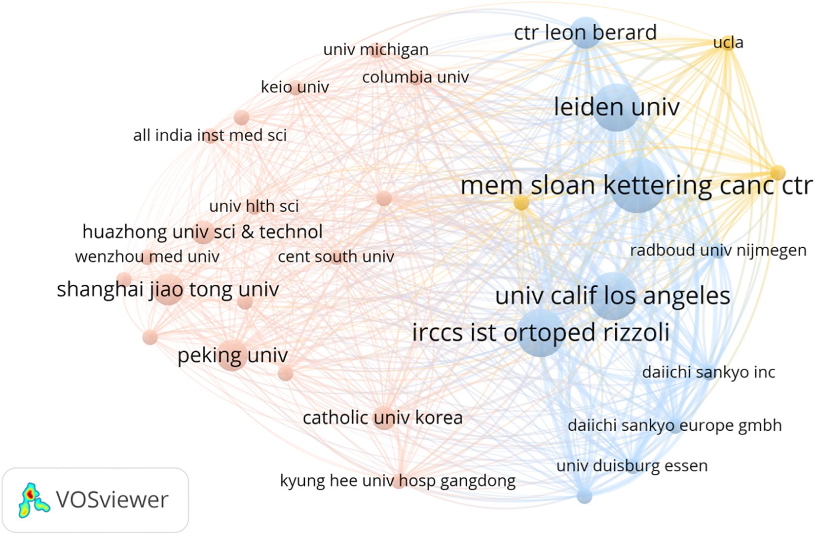 Figure 8. The institutions collaboration network of the most cited articles on TGCT recurrence. From: VOSviewer.