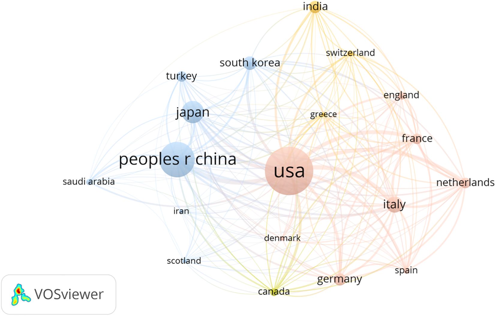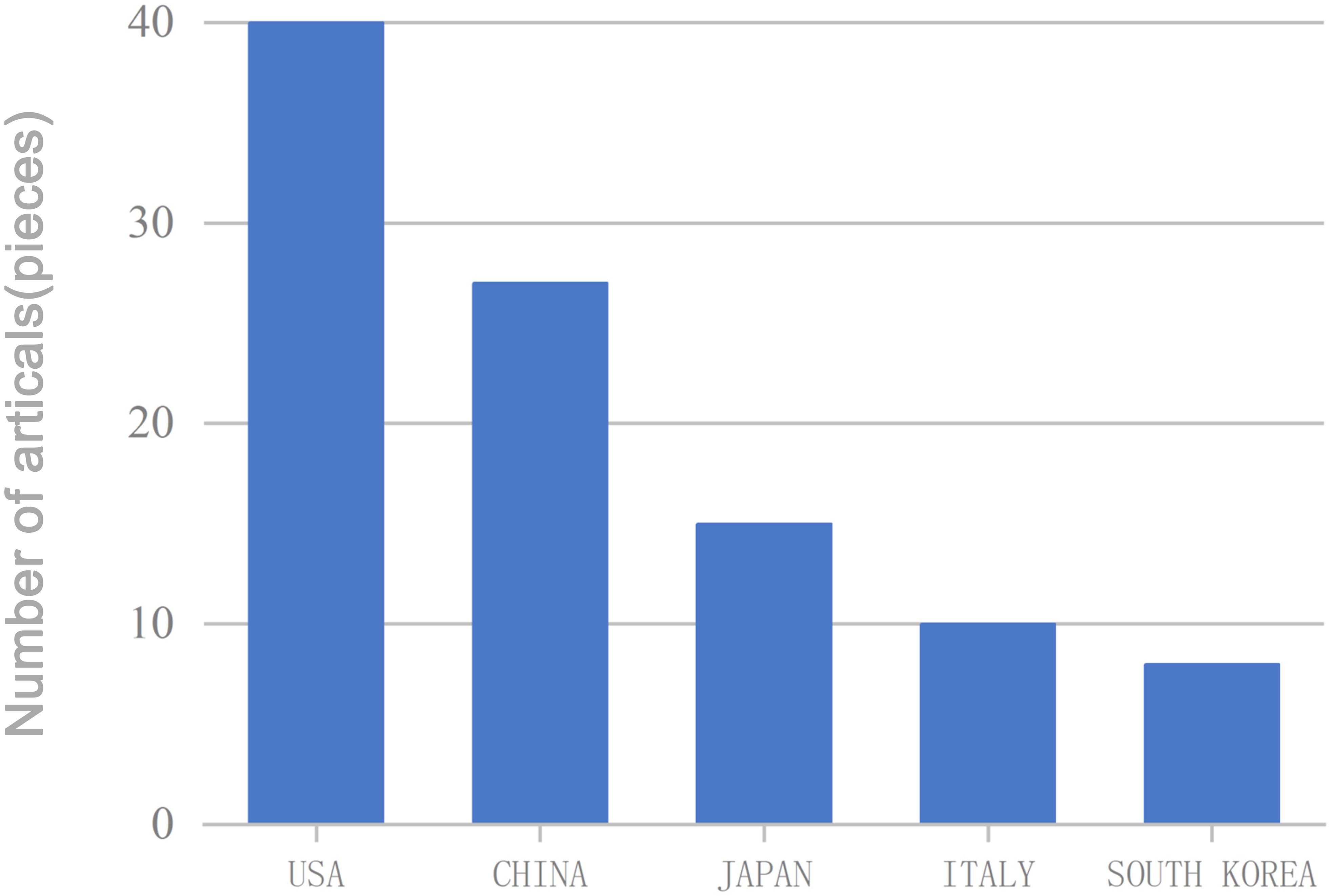 The authors were affiliated with 100 institutions, of which 48 appeared multiple times. Memorial Sloan Kettering Cancer Center was the most frequently listed institution, appearing seven times (Figure 7). Institutional collaboration networks are shown in Figure 8. These institutions spanned 29 countries and regions, with 19 countries appearing multiple times. The United States led in publication count, number of researchers, and participating institutions, followed by China. The US accounted for 40 mentions, China 27, and Japan 15. Publications from the US and China together represented nearly half (50.0%) of all studies (Figure 9). International collaboration networks are shown in Figure 10.