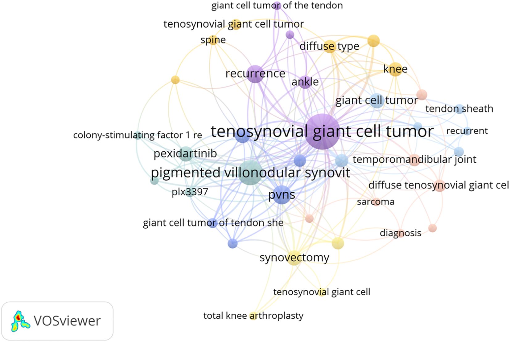 Results: Among the identified articles, the most frequently cited publication received 123 citations. The University of California was found to be the most influential institution in terms of citation frequency, while the United States ranked first in the number of publications. A steady increase in research activity was observed, particularly between 2021 and 2024. Nicholas Matthew Bernthal was identified as the most prolific author, with eight publications. Keywords indicating major research hotspots included “tenosynovial giant cell tumor,” “surgical treatment,” “recurrence,” “synovectomy,” and “radiotherapy.” Fourteen articles specifically addressed multimodal treatment strategies, highlighting a critical direction of research in this field.