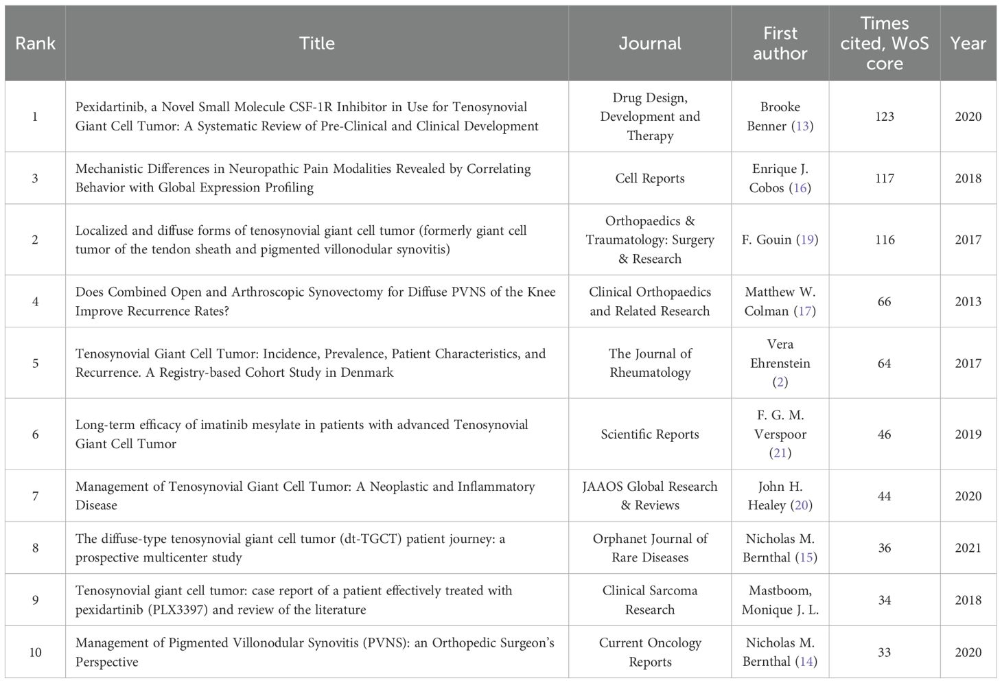Based on study design, 100 studies were clinical, 12 were basic research, and 22 were reviews. Thematically, 45 publications focused on treatment, including 19 on surgical treatment, 12 on non-surgical interventions, and 14 on combined strategies. Additional analyses included 18 studies on prognostic factors, seven on TGCT pathogenesis and recurrence mechanisms, 17 on diagnostic techniques and tumor features, and 47 case reports. The most-cited paper among the 134 articles was Pexidartinib, a Novel Small-Molecule CSF-1R Inhibitor for TGCT: Systematic Review of Preclinical and Clinical Development (Table 1) (2, 13–21), published by Brooke Benner at the Ohio State University Comprehensive Cancer Center in 2020. This review highlighted that surgical excision remains the standard treatment for TGCT; however, recurrence, unresectable tumors, or potential limb amputation remain challenges. The review also emphasized that CSF-1/CSF-1R-targeted agents, such as pexidartinib, demonstrated significant efficacy, though long-term effects require further clinical follow-up (22, 23). The second most-cited article, Behavior and Global Expression Profiles Reveal Mechanistic Differences in Neuropathic Pain Types (19), published in Cell Reports by Boston Children’s Hospital in 2018, highlighted mechanism-based interventions for neuropathic pain following peripheral nerve injury, including targeting TrpV1-positive nociceptors and immune cell modulation. The third highly cited study, Localized and Diffuse Tenosynovial Giant Cell Tumor (Previously TGCT/PVNS) (16), published by F. Gouin from CHU de Nantes in 2016, reaffirmed complete surgical resection as first-line treatment, emphasizing more aggressive approaches for diffuse TGCT and the therapeutic potential of CSF-1R inhibitors.