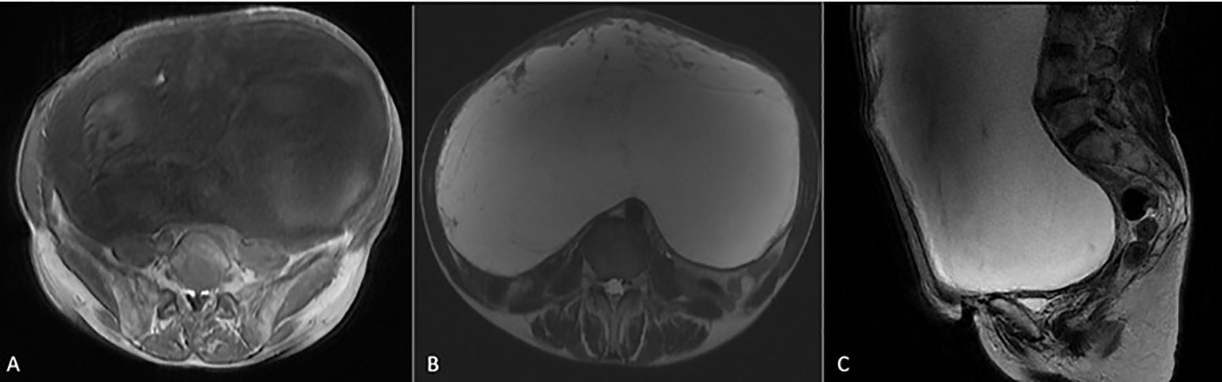 Figure 2. MRI images of the giant hydropic leiomyoma (HLM). (A) T1-weighted image showing the leiomyoma with low-to-intermediate signal intensity, reflecting the tumor’s solid components. (B) T2-weighted image demonstrating high signal intensity within the leiomyoma, indicative of significant fluid accumulation due to hydropic degeneration. (C) T2-weighted MRI in the sagittal plane showing a large HLM with high signal intensity. The mass causes significant mass effect on adjacent organs, displacing the bladder anteriorly and compressing the rectum posteriorly.