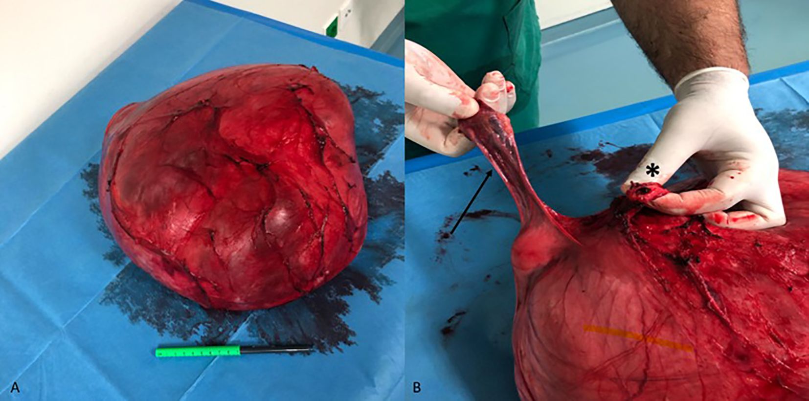 During anterior dissection, the tumor was successfully dissected off the bladder, and the cervix was identified. After ligation and division of the round, broad, sacro-uterine, and transverse cervical ligaments of the uterus, vaginal transection was performed. The specimen of the tumor en bloc, along with the uterus and the right ovary, was sent for histopathological examination (Figures 3A, B). The total operative time was 4 hours 11 minutes, and the patient was transferred to the ward without postoperative administration in the intensive care unit.