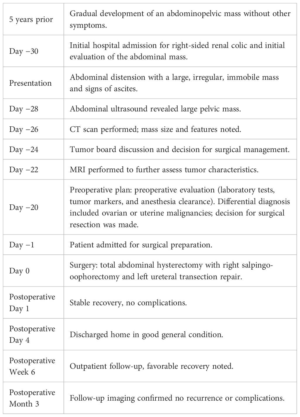 The patient had an uncomplicated postoperative course and was discharged on the fourth postoperative day, with no signs of complications during outpatient visits. The pigtail stent was removed following an ascending urethrocystography, which confirmed ureteral anastomotic integrity and the absence of leakage. A subsequent cystoscopy was then performed to complete the evaluation and facilitate the stent’s removal. On 6-month follow-up, she remained symptom-free, with no evidence of recurrence on ultrasound. A concise overview of the patient’s course is presented in Table 1.
