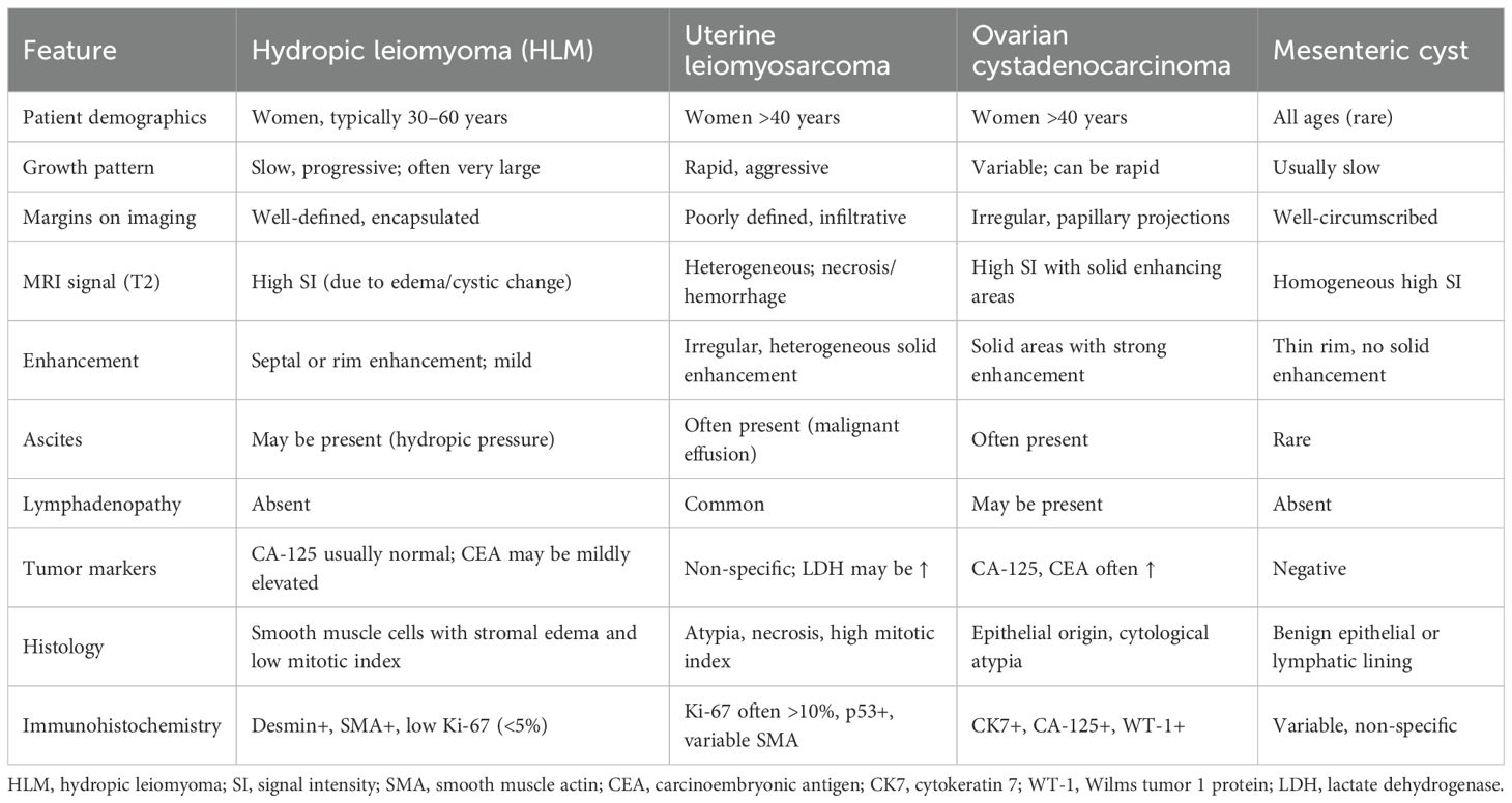 HLMs may present on MRI with imaging features that overlap with malignant tumors, particularly leiomyosarcoma, endometrial stromal sarcoma, and ovarian cystic malignancies. Common features that raise suspicion for malignancy include large size, thick septations, cystic-solid architecture, and associated ascites. In our case, these characteristics necessitated careful preoperative evaluation and tumor board discussion (11). However, several radiologic findings were more suggestive of a benign process. These included the well-defined tumor margins, lack of infiltrative behavior, absence of intratumoral necrosis, and no evidence of pelvic or para-aortic lymphadenopathy or peritoneal nodules. Additionally, there was no enhancement of solid components in a pattern typical of aggressive sarcomas. The T2-weighted hyperintensity corresponded histologically to interstitial fluid accumulation and stromal edema, which are hallmark features of hydropic degeneration. Together, these imaging characteristics—although atypical—favored the diagnosis of a benign but degenerative leiomyoma, supporting the decision to proceed with surgical management. To further assist in differential diagnosis, a comparative summary of radiologic and clinical features distinguishing HLM from other cystic abdominopelvic masses is presented in Table 2.