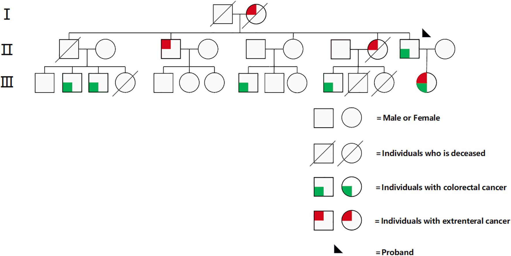 Pedigree chart illustrating family history of cancer. Squares and circles represent males and females, respectively. A diagonal line indicates deceased individuals. Red and green quadrants signify individuals with external and colorectal cancer. The proband is marked with a black triangle.