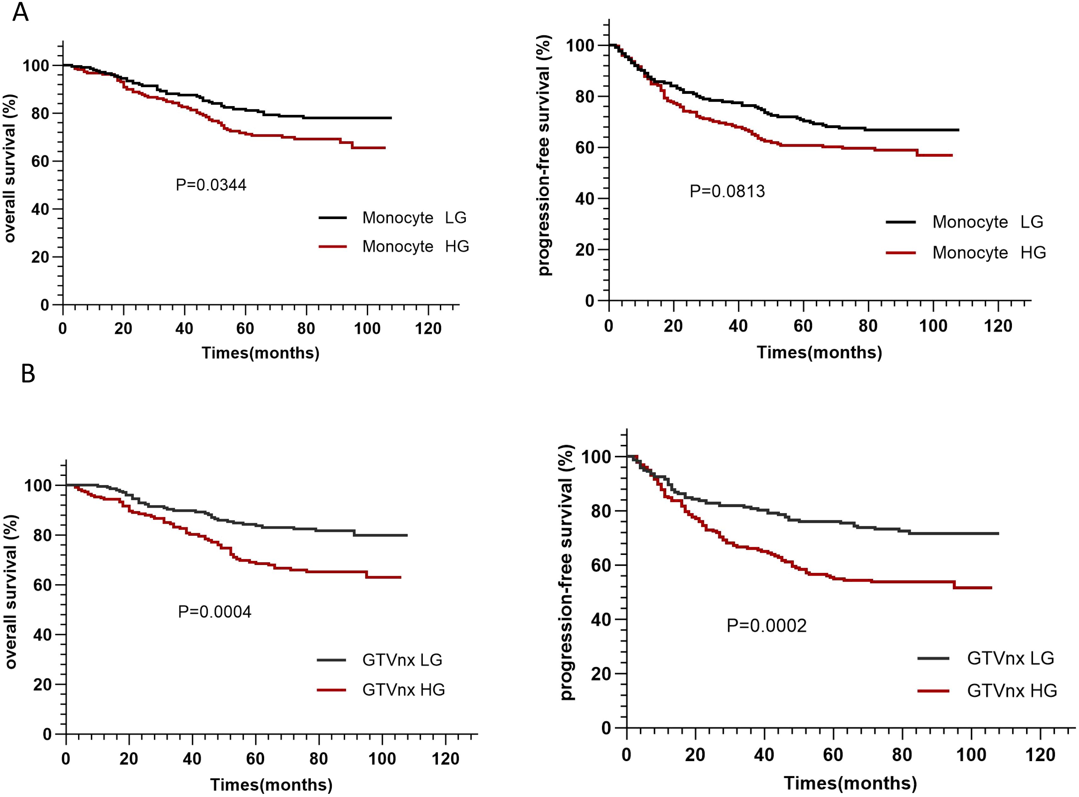Figure 1. The Kaplan–Meier survival curves of monocyte count (A), GTVnx (B) based on the overall survival (OS) and progression-free survival (PFS) in NPC patients. (Monocyte LG: monocyte count <0.29×109/L, Monocyte HG: monocyte count ≥0.29×109/L, GTVnx LG: GTVnx <28.5cm3, GTVnx HG: GTVnx ≥28.5cm3.).