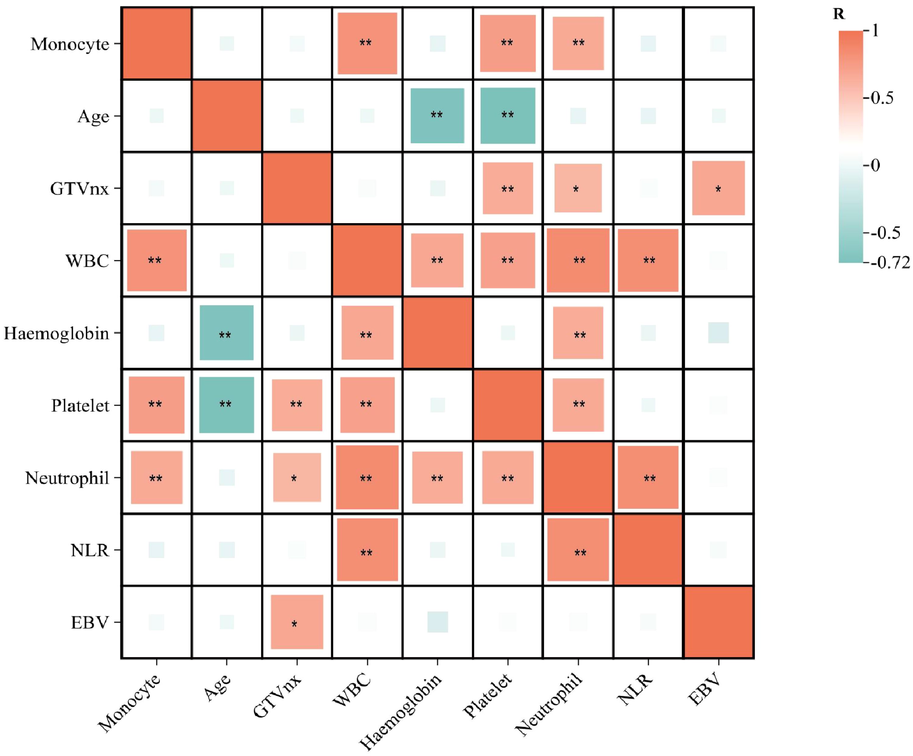 The correlation analysis of Figure 2 showed that peripheral blood monocyte count was positively correlated with WBC, platelet, and neutrophil (P<0.05). GTVnx was positively correlated with platelet, neutrophil, and Epstein-Barr virus before treatment (P<0.05). As shown in Supplementary Figure S1, the higher the peripheral blood monocyte count at 1 month, 2 months, and 3 months after radiotherapy, the worse the OS and PFS, which supports our previous conclusion.