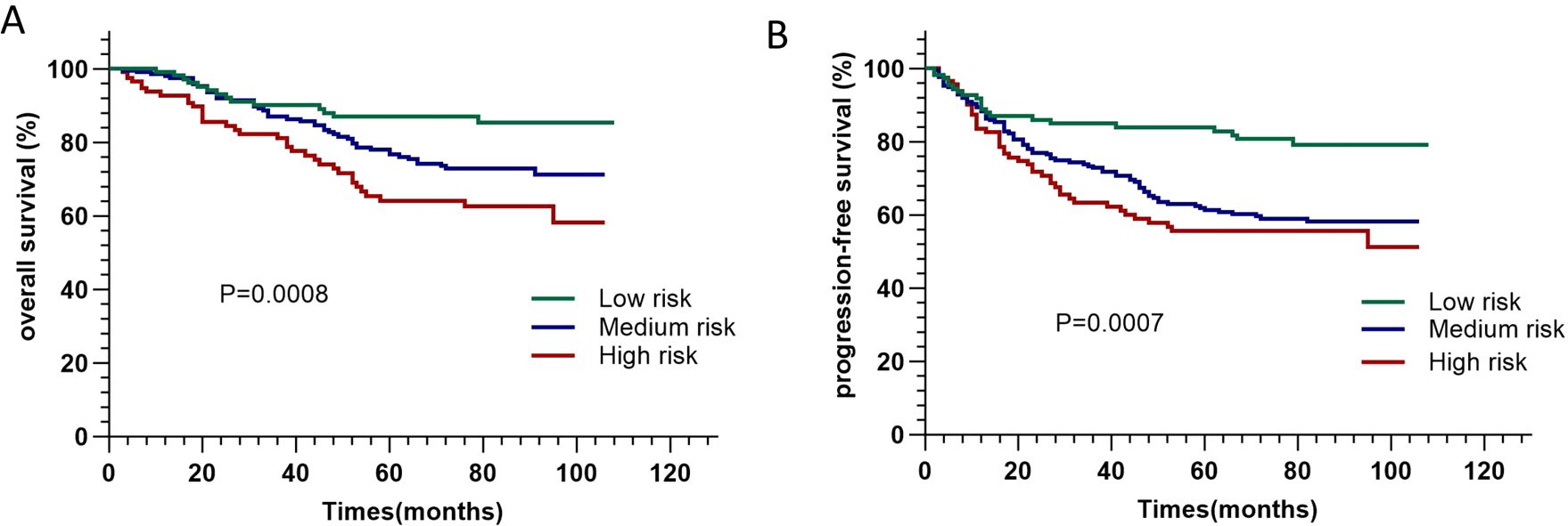 Figure 3. Kaplan-Meier curves of overall survival (A) and progression-free survival (B) of patients in different risk groups.
