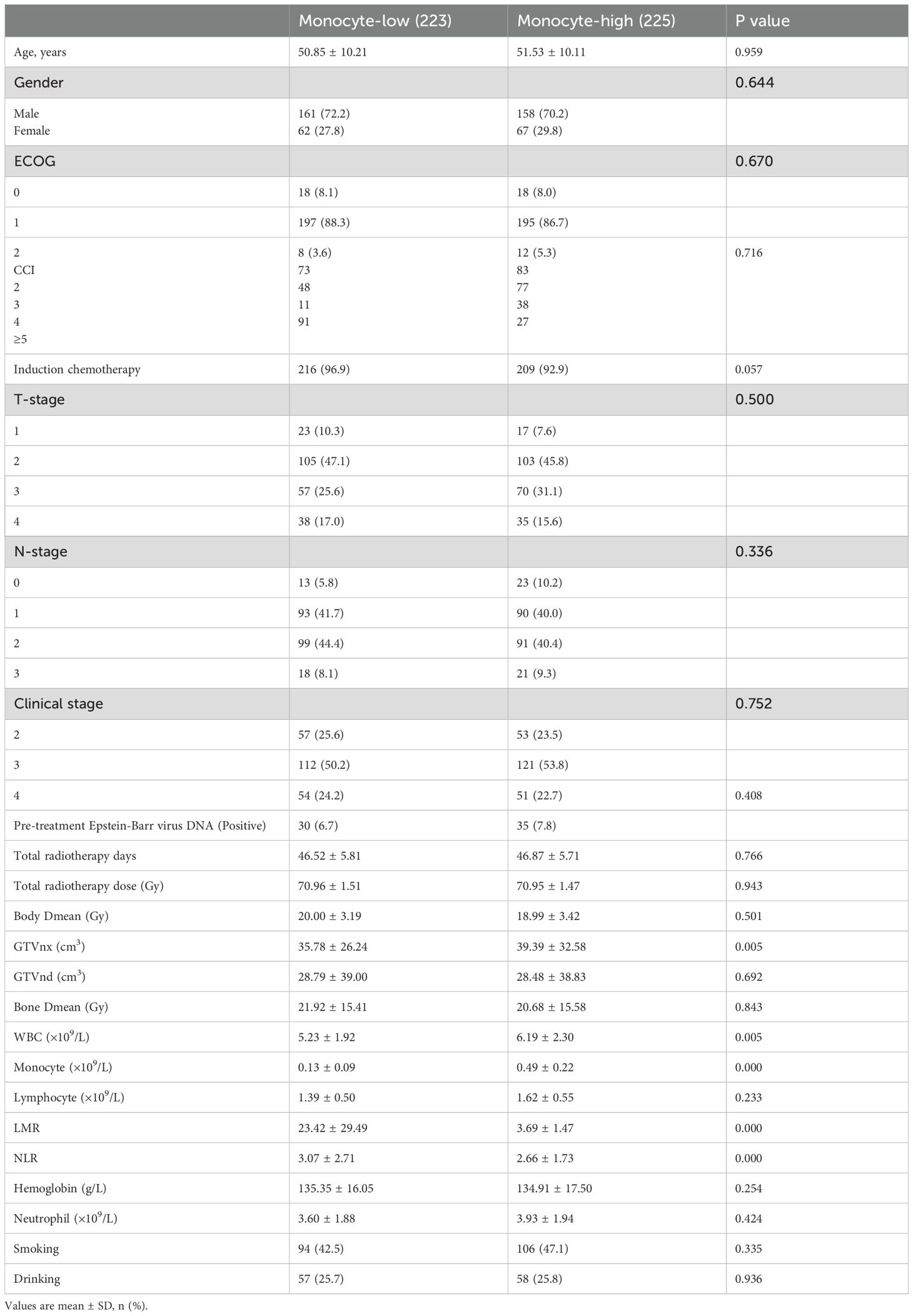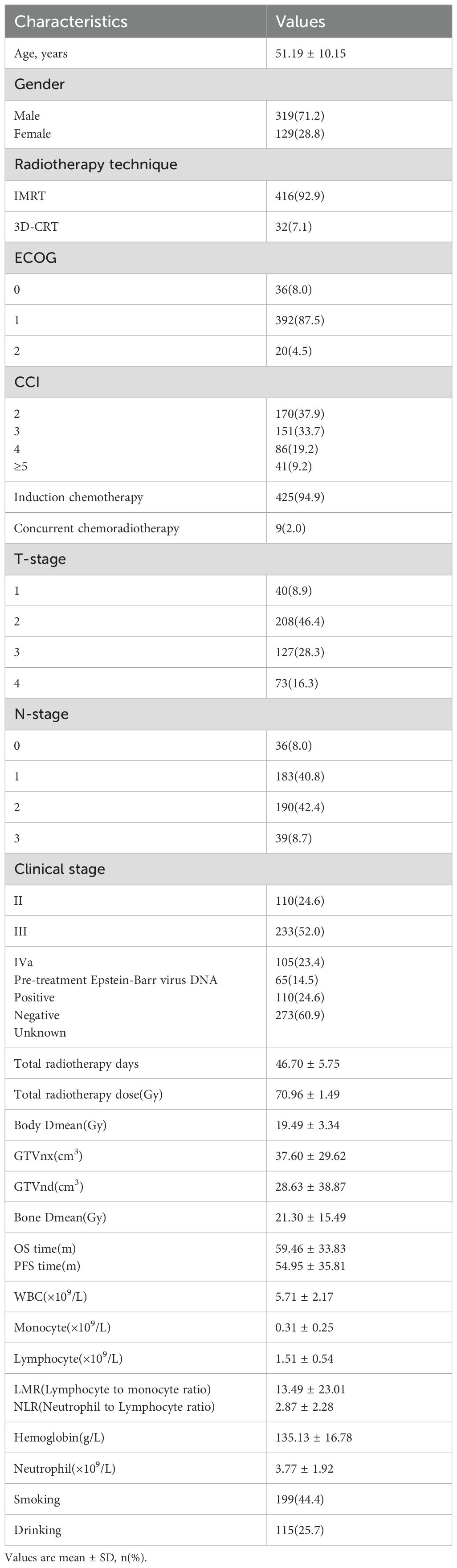 A total of 448 NPC patients were included in the final analysis. Among them, 319 (71.2%) were males, 416 (92.9%) patients underwent intensity-modulated radiation therapy (IMRT) and 32 (7.1%) patients underwent three-dimensional conformal radiation therapy (3D-CRT). There were 428 (95.5%) patients with ECOG score 0-1 and 20 (4.5%) patients with ECOG score 2. The mean age of all NPC patients was 51 years, 425 of whom underwent induction chemotherapy before, and 110 (24.6%), 233 (52%), and 105 (23.4%) patients with comprehensive stage II, III, and IV, respectively. The median follow-up time was 74.3 months (interquartile range 24.7-87.8). At the last follow-up, 97 people (21.7%) had died from all causes. Radiotherapy parameters for all patients were as follows: mean total radiotherapy days were 47 days, mean total radiotherapy dose was 71Gy, mean body Dmean (Gy) radiotherapy dose was 19.5Gy, mean GTVnx was 37.6cc, GTVnd was 28.6cc, and mean bone dose was 21.3Gy. Baseline routine blood parameters were as follows: mean blood white blood cell count of 5.71, mean monocyte count of 0.31, mean lymphocyte count of 1.51, mean lymphocyte count to monocyte count ratio of 13.5, mean Hemoglobin is 135, mean neutrophil count is 3.77 (Table 1).