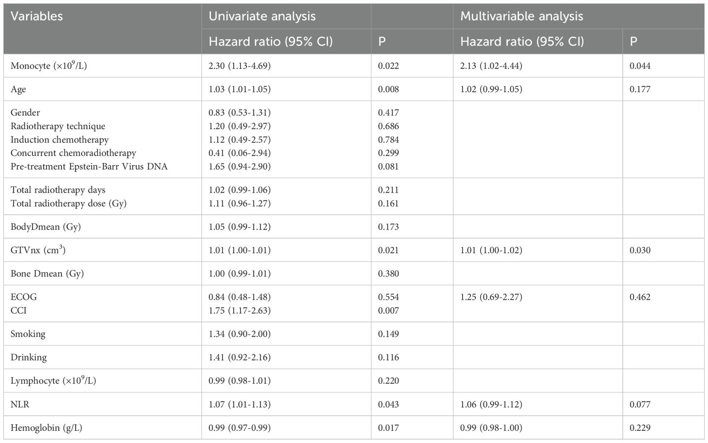 In the univariate Cox regression analysis (Table 2) gender, radiotherapy technique, induction chemotherapy, concurrent chemoradiotherapy, EBV DNA, ECOG, CCI, smoking, and drinking are categorical variable), parameters such as monocyte count [HR 2.30, 95%CI (1.13-4.69)], age[1.03(1.01-1.05)], GTVnx[1.01(1.00-1.01)], CCI[1.75(1.17-2.63)], NLR[1.07(1.01-1.13)], Hgb[0.99(0.97-0.99)] were shown to be significantly associated with OS. In the multivariate Cox regression analyses (Table 2), monocyte count[2.13(1.02-4.44)] and GTVnx[1.01(1.00-1.02)] were independently associated with OS.