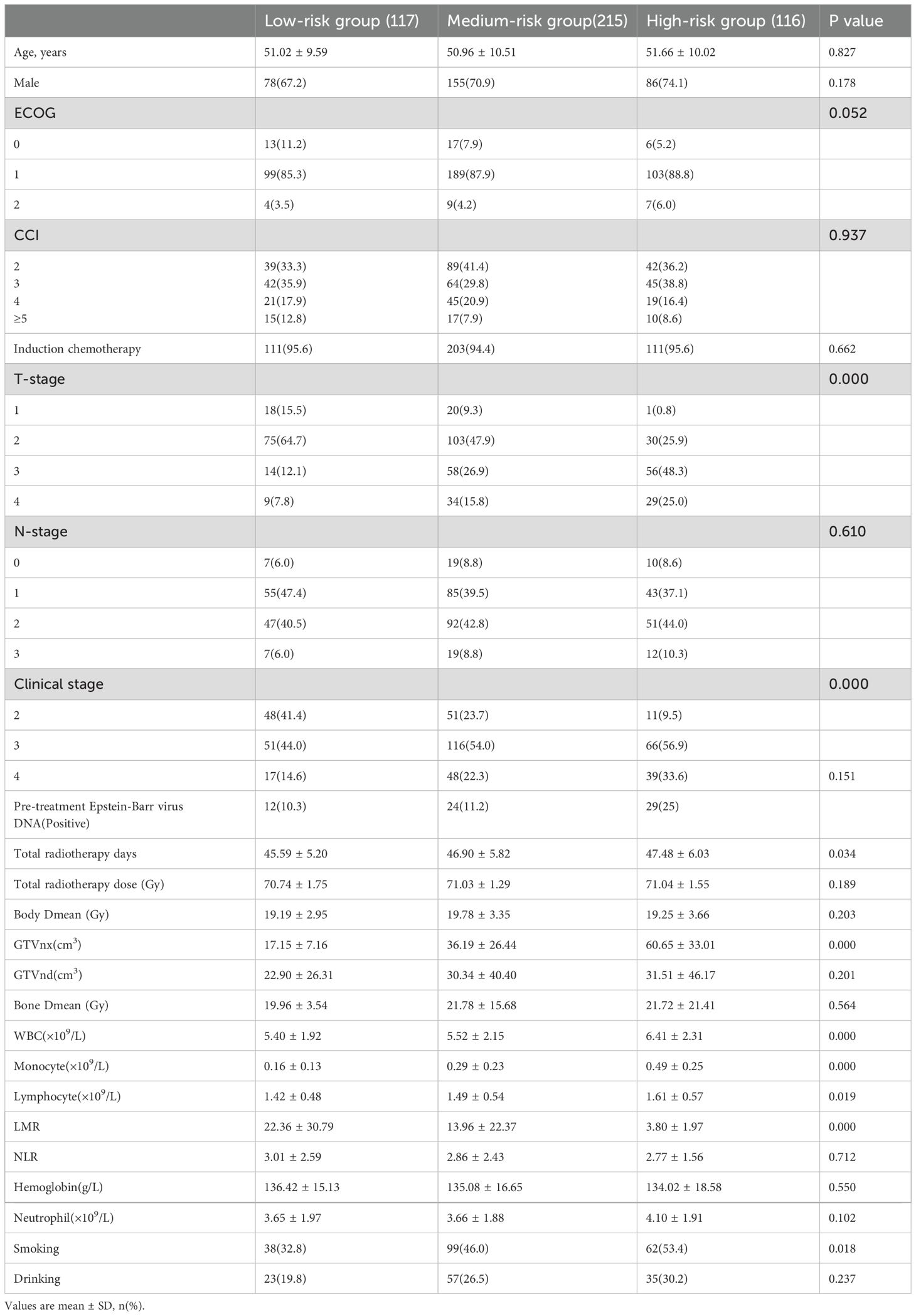 Materials/methods: We included newly diagnosed non-metastatic NPC patients who underwent radiotherapy in our hospital from January 2013 to December 2015. General clinical characteristics such as age, gender, ECOG score and tumor stage, peripheral blood monocyte count, lymphocyte count, white blood cell count (WBC), neutrophil count, radiotherapy technology, total radiotherapy days, gross tumor volume of nasopharyngeal carcinoma (GTVnx) and gross tumor volume of cervix node (GTVnd) of patients before radiotherapy, and whether chemotherapy was induced were recorded. The primary endpoint was overall survival, the secondary endpoint was progression-free survival. Univariate and multivariate COX regression were used to analyze the relationship among peripheral blood monocyte count, GTVnx, and survival outcomes. Spearman correlation analysis was used to analyze the correlation between risk factors. Based on the independent risk factors for OS, we further divide patients into three different risk groups, and the differences in clinical and therapeutic indicators and survival outcomes between the three groups were analyzed using a one-way analysis of variance.