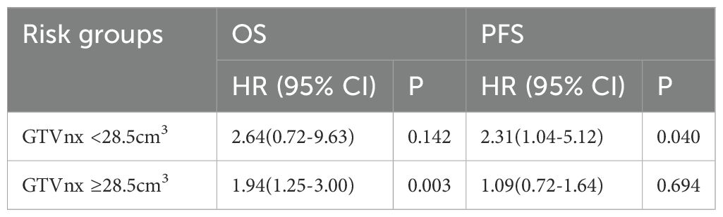 Supplementary Table 1 | The effect of GTVnx volume per unit increase on OS and PFS in different groups.