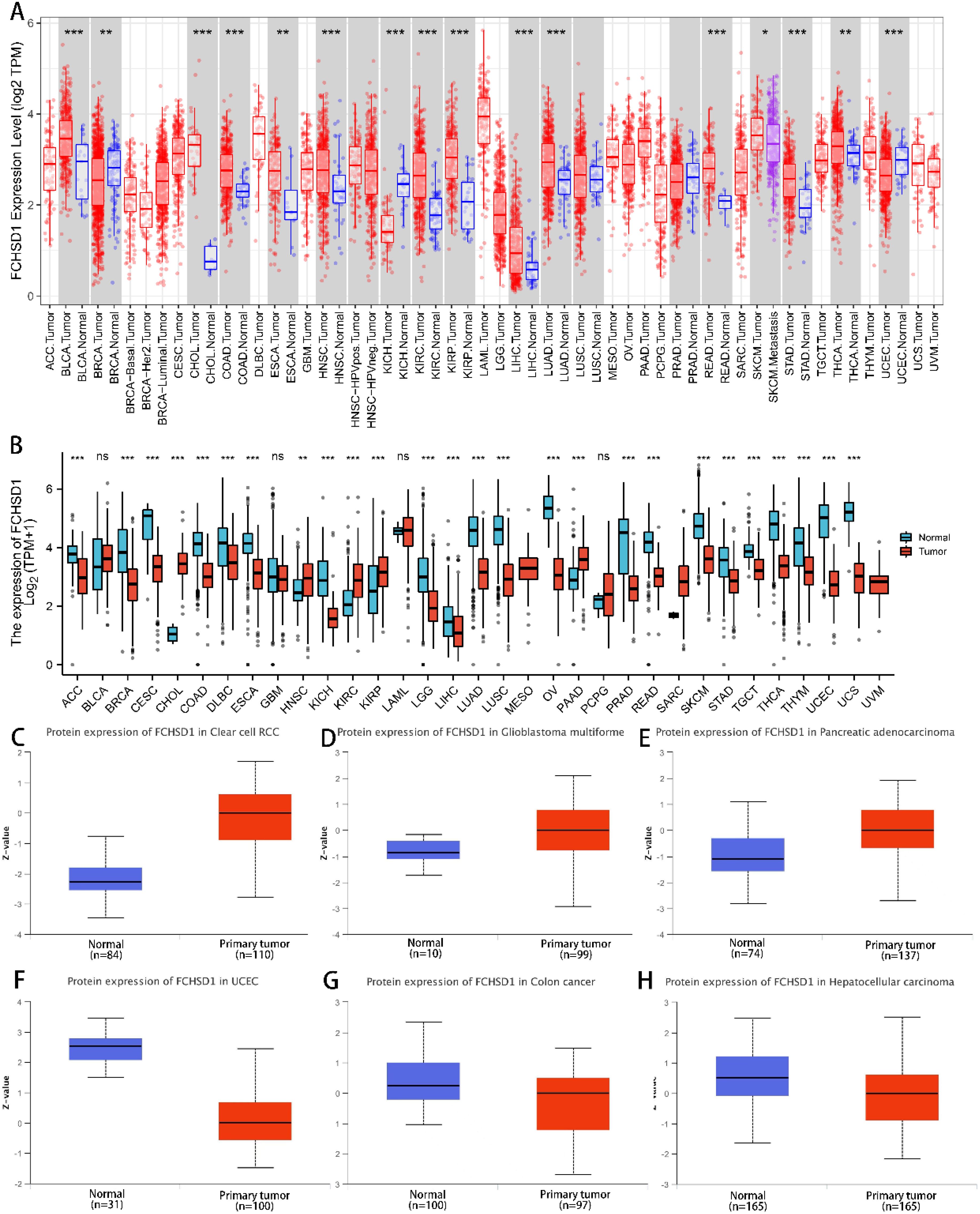 Figure 1. FCHSD1 expression is upregulated in most types of cancers compared with controls. (A) Exploration of FCHSD1 mRNA expression in human cancers and normal tissues using the TIMER database. (B) Comparison of FCHSD1 mRNA expression in human cancers using the R package. (C-H) FCHSD1 protein expression is changed in cancers examined using the UALCAN database. *p < 0.05, **p < 0.01, ***p < 0.001.