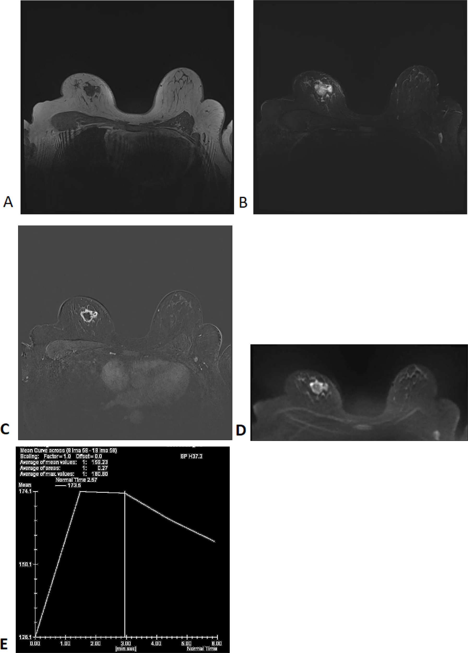 MRI Findings: T1WI (A), T2WI (B), T1WI+Contrast (C), DWI (D), DCE-Curve (E).