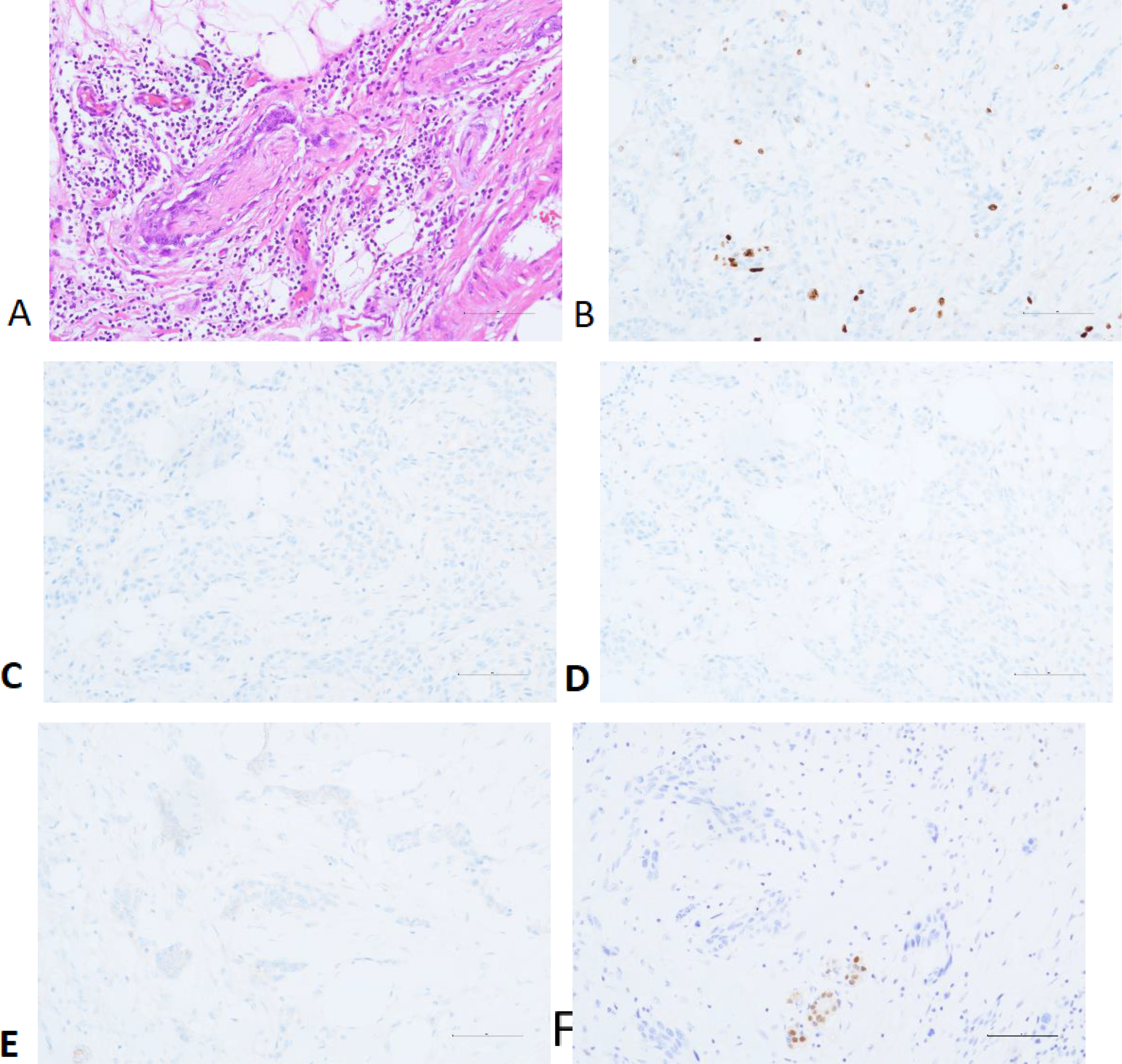 Perineural Invasion (A) and Immunohistochemistry: Ki-67 (B), ER (C), PR (D), HER-2 (E) and AR (F).