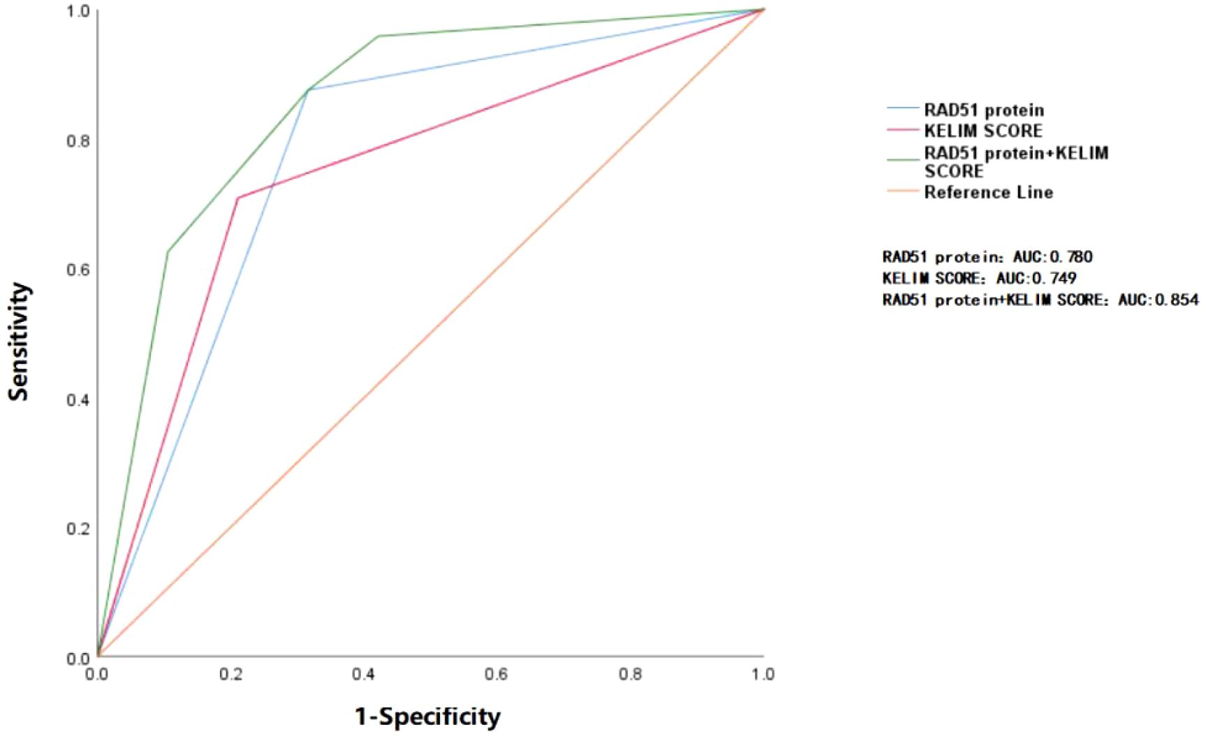 Figure 2. ROC curve analysis of RAD51 protein and KELIM score in predicting platinum resistance relapse. The area under the blue curve represents the AUC (0.780) for RAD51 protein alone in predicting the recurrence of platinum resistance. The area under the red curve corresponds to the AUC (0.749) for the KELIM score alone in predicting the same outcome. The area under the green curve reflects the AUC (0.854) when both RAD51 protein and KELIM score are used together for prediction. The differences between the three curves are not statistically significant (P > 0.05).