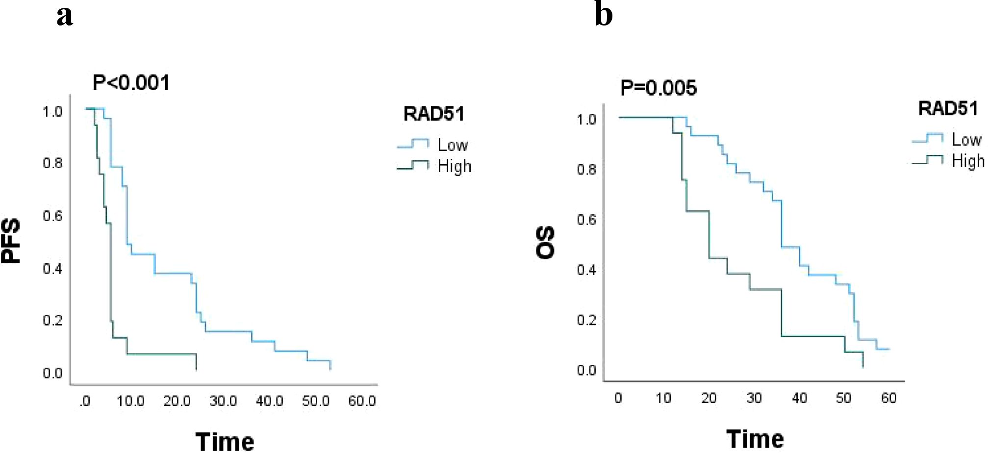 Figure 3. (a) PFS based on RAD51 protein expression (n = 43), P < 0.001. (b) OS based on RAD51 protein expression (n = 43), P = 0.005.