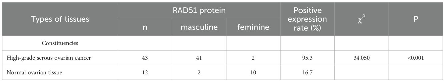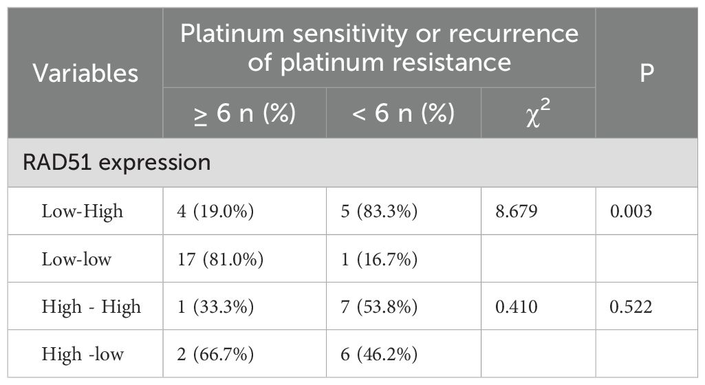 In this study, we observed that 19 patients experienced recurrence of platinum resistance. Among them, 13 patients (68.4%, or 13 out of 19) had high RAD51 protein expression, while 6 patients (31.6%, or 6 out of 19 had low expression. In contrast, among the patients with platinum-sensitive recurrence, 87.5% (21 out of 24) exhibited low RAD51 protein expression, with only 3 cases (12.5%, or 3 out of 24) showing high RAD51 expression. The difference between these two groups was statistically significant (P < 0.001), indicating a strong correlation between high RAD51 expression and the recurrence of platinum resistance.