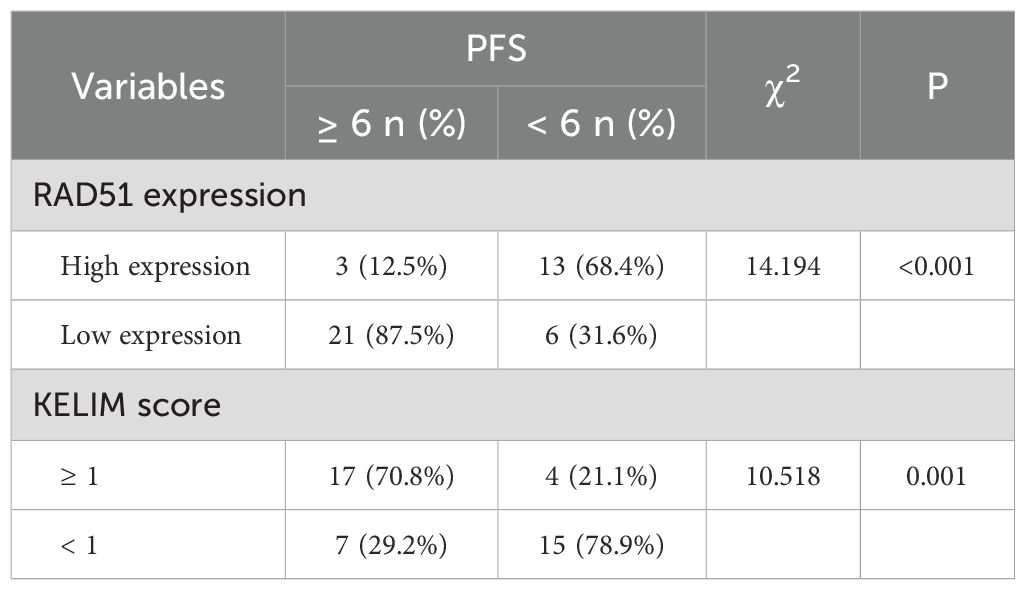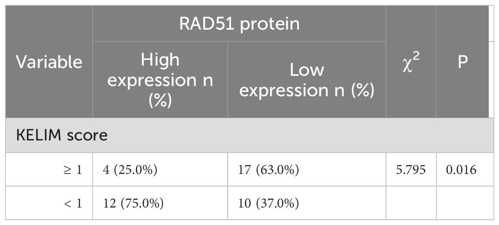 Among the 16 patients with high RAD51 protein expression, 12 patients (representing 75.0%, or 12 out of 16) had a KELIM score of less than 1, while the remaining patients had a KELIM score of 1 or higher. Conversely, among the 27 patients with low RAD51 protein expression, 17 patients (63.0%, or 17 out of 27) had a KELIM score of 1 or higher, and the rest had a KELIM score of less than 1. The difference in KELIM scores between the two groups was statistically significant (P = 0.016), as illustrated in Table 3. These findings suggest that RAD51 protein expression in ovarian cancer tissues is closely related to the KELIM score and chemotherapy sensitivity. High RAD51 expression is correlated with low KELIM scores and reduced sensitivity to neoadjuvant chemotherapy, whereas low RAD51 expression is associated with high KELIM scores and increased sensitivity to neoadjuvant chemotherapy.