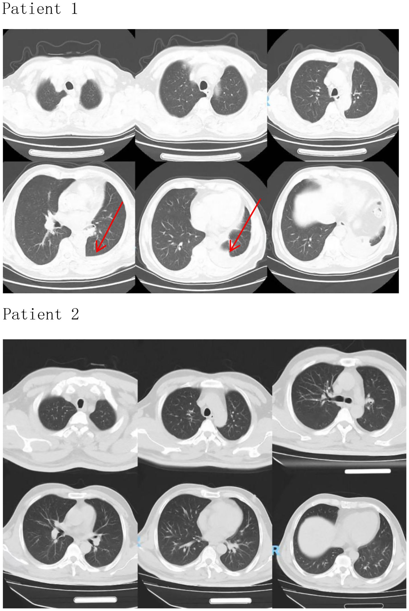 Figure 1. Patient 1 (The arrow indicates the left lower lobectomy site on the CT image.), Patient 2.