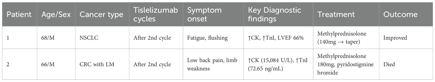 The stark contrast in outcomes between these two patients emphasizes the critical importance of risk stratification prior to initiating ICIs like tislelizumab. A thorough assessment to determine of a history of autoimmune diseases is mandatory. The two patients exhibited varying degrees of cardiac injury with divergent outcomes, underscoring the necessity for proactive and regular cardiac function assessment during tislelizumab therapy, including baseline and serial measurements of troponin and brain natriuretic peptide (BNP) levels, as well as electrocardiograms, especially during the first 6 weeks of treatment, to enable early detection and diagnosis of myocardial damage. Upon confirmation of immune myocarditis, immediate discontinuation of tislelizumab and initiation of high-dose methylprednisolone steroid therapy are imperative. As highlighted by a systematic review of 60 patients with immune checkpoint inhibitor (ICI)-induced myocarditis/myositis/myasthenia gravis overlap syndrome (IM3OS), this condition carries high lethality. Key findings include median symptom onset after the first ICI dose, predominant manifestations of fatigue (80%) and muscle weakness (78%), markedly elevated creatine kinase (mean: 9,645 IU/L), and arrhythmias in 67% of patients. Despite universal high-dose steroid administration, in-hospital mortality reached 60%, with no survivors rechallenged with ICIs (14). This syndrome reflects fatal multisystem autoimmune involvement, necessitating proactive neuromuscular toxicity screening in ICI-related myocarditis cases (and vice versa), where early multidisciplinary intervention may improve outcomes. Integrating these clinical data with our severe adverse events, we emphasize that timely and adequate steroid therapy must be administered, with dose reduction considered only after documented improvement in cardiac enzymes. Particular caution in steroid tapering is warranted for patients with underlying high-risk factors. These cases further provide therapeutic reference for managing tislelizumab-induced immune myocarditis.