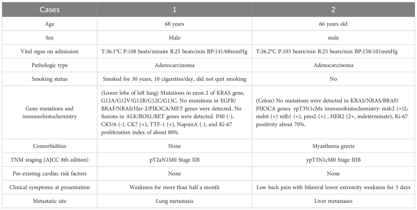 Cardiotoxicity can be a fatal complication associated with immunotherapy, with clinical manifestations ranging from asymptomatic elevated cardiac biomarkers to varying degrees of response such as heart failure, arrhythmias, cardiac fibrosis, cardiogenic shock, and fatal myocarditis (1, 2). Immune-associated myocarditis is a rare cardiotoxicity in immunotherapy with unknown predisposing factors. Although the reported incidence of immune-associated myocarditis is only 0.39%, it is often fulminant with a mortality rate of >50% (3). To date, there are few relevant cases of immune-associated myocarditis in the available reports. In this case study, we report a patient with non-small cell lung cancer and a patient with postoperative liver metastases from rectal cancer, who both developed immune-associated myocarditis during immunotherapy with tislelizumab. Clinical timeline and outcomes of two patients with tislelizumab-induced myocarditis (Table 1).