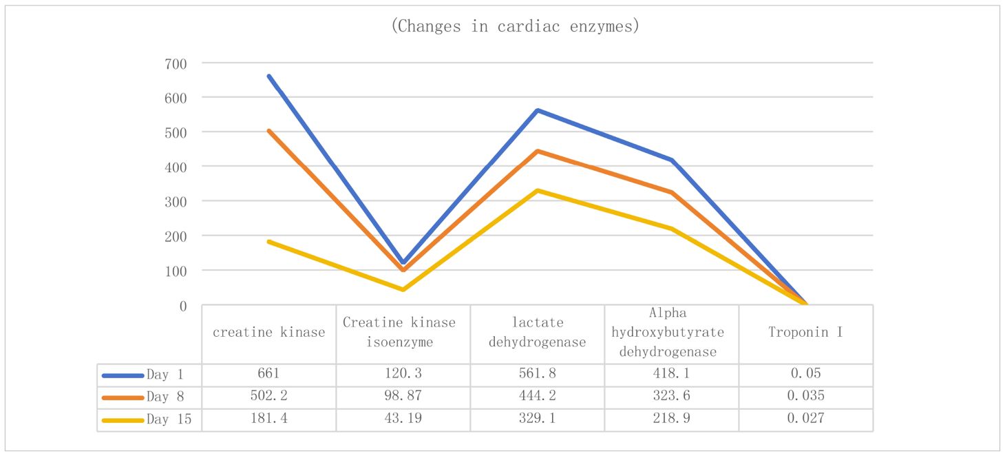 Therefore, the third cycle of tislelizumab treatment was stopped, and methylprednisolone sodium succinate 140 mg (once daily, IV) was administered immediately. After 3 days of treatment, the symptoms did not show significant improvement, indicating poor efficacy, so the dose was increased to 160 mg (once daily, IV). After 4 days, the symptoms improved significantly. Repeat myocardial examination and cardiac enzyme testing also showed improvement. The dose of methylprednisolone sodium succinate was then reduced to 80 mg (once daily, IV) for 5 days, then to 60 mg for another 3 days, and finally to 30 mg (once daily, IV). Subsequent review of cardiac enzyme levels and other indicators (Table 3) showed further improvement.