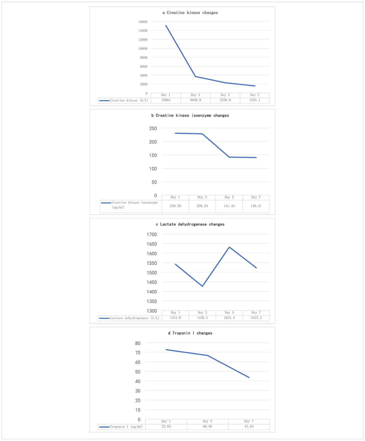 Admission diagnosis: colon cancer (ypT1cN1M0stage IIIB). Cardiac enzyme indexes at the time of consultation are shown in Table 4 (4a-d, hereinafter referred to as Table 4). Cardiac enzyme indexes suggested that the heart damage was more severe, and cardiac ultrasound indicated a left ventricular ejection fraction of 58%. The patient complained of bilateral lower limb weakness and other discomforts but no chest pain or tightness. He was diagnosed with immune-related myocarditis. Therefore, the second cycle of tislelizumab treatment was stopped, and methylprednisolone sodium succinate 180 mg (once daily, IV) was administered.
