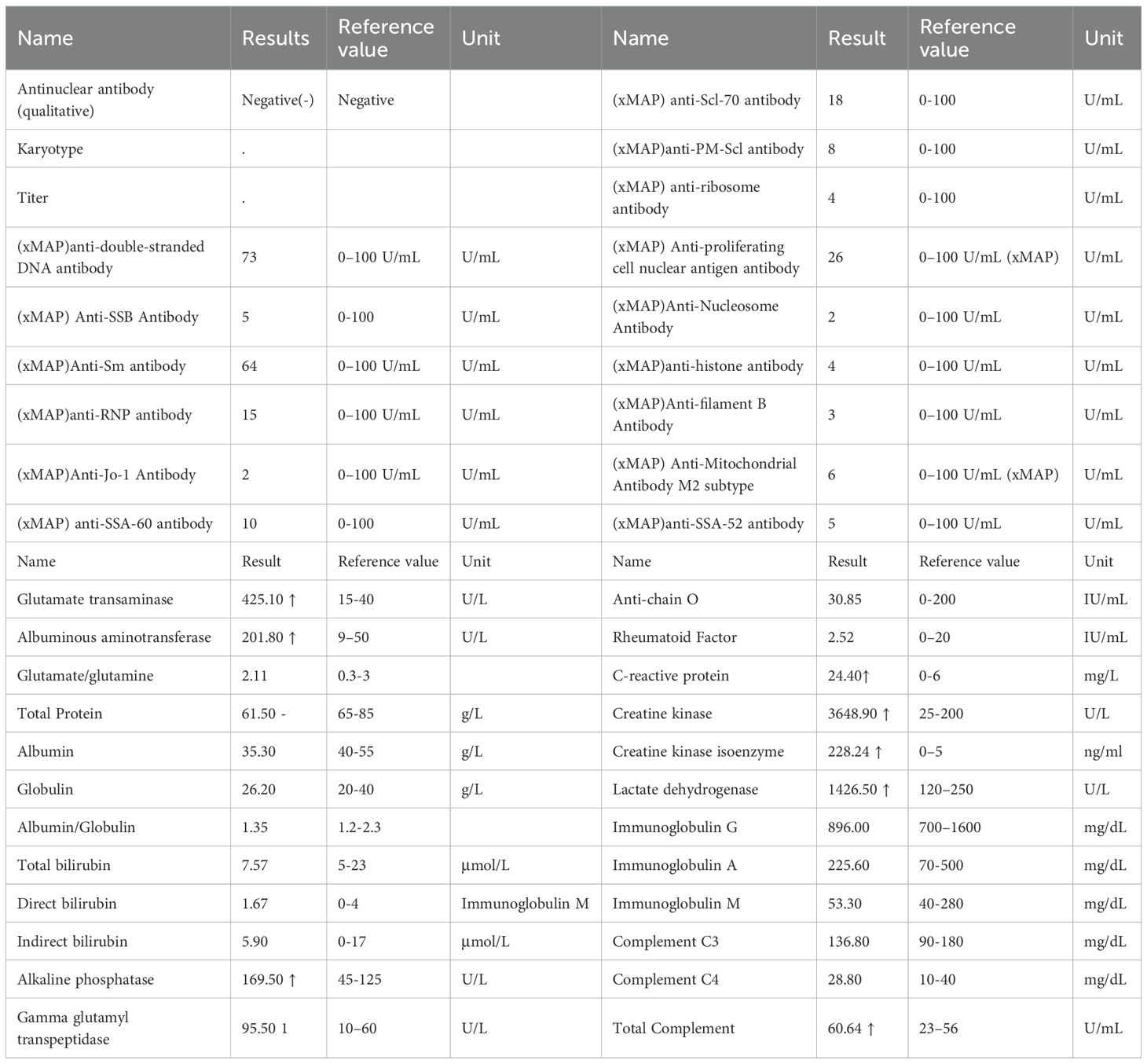 The patient’s symptoms did not show significant improvement. Considering the patient’s history of myasthenia gravis, cardiac enzymes (Table 4), immune indicators, and antinuclear antibody results (Table 5) were reviewed, suggesting that myocardial damage had worsened. As the hormone dosage had reached the maximum tolerated dose, the patient continued methylprednisolone sodium succinate 180 mg (once daily, IV) and was additionally treated with pyridostigmine bromide for myasthenia gravis. After 2 days, cardiac enzyme levels decreased (Table 4), and the patient’s symptoms slightly improved, although the condition remained serious. High-dose steroid therapy was continued, and repeat cardiac enzyme review after 2 more days (Table 4) showed further improvement. The patient’s cardiac enzyme levels and subjective symptoms were better than before.