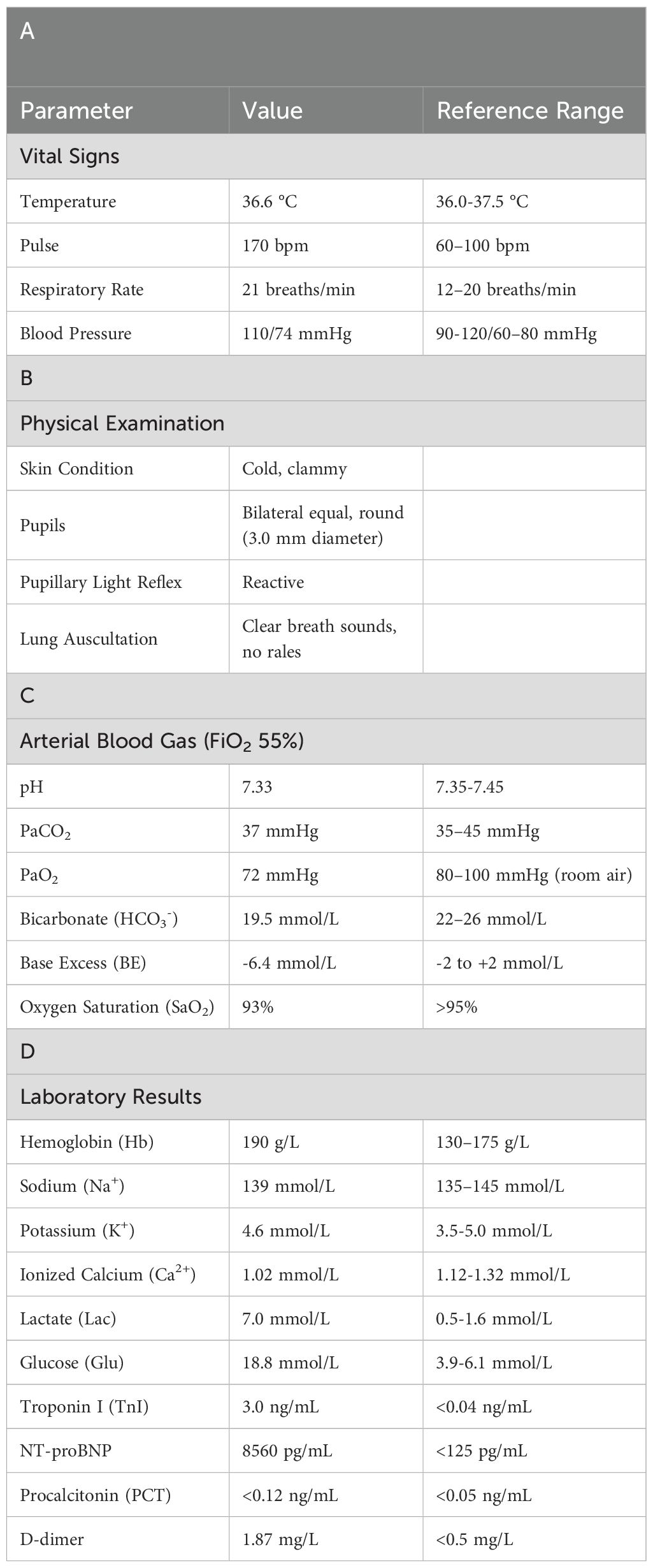 At 13:32, ECG monitoring showed an escape heart rhythm, ventricular rate of about 90 beats/min, wide QRS complex deformity, and blood pressure of approximately 60/40 mmHg. The patient became unresponsive to verbal stimuli, pupils were dilated, and light reflexes disappeared. Endotracheal intubation and ventilator-assisted ventilation were immediately performed, along with continuous cardiopulmonary resuscitation. Norepinephrine and dopamine were continuously infused to raise blood pressure, and adrenaline was administered to enhance cardiac function, along with rapid fluid replacement and other supportive treatments.