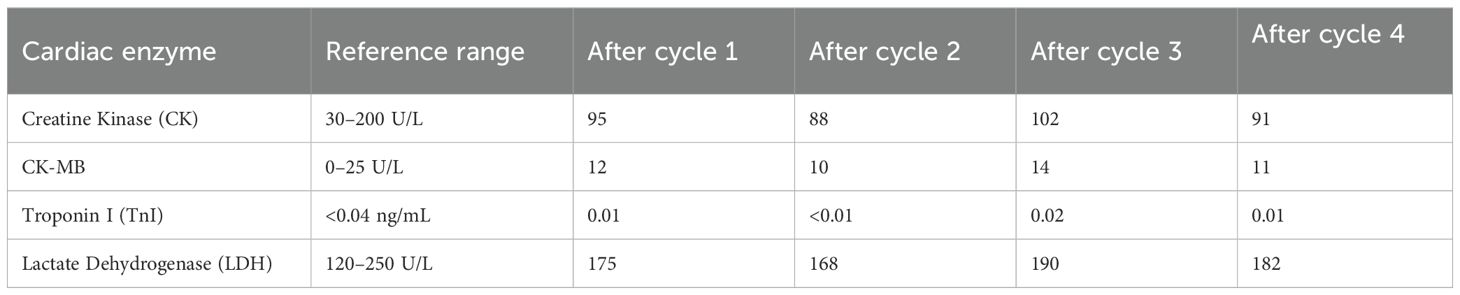 Upon admission, Patient 1 was diagnosed with adenocarcinoma of the left lower lung lobe (pT2aN1M0). Initial cardiac enzyme levels were elevated (Table 3), raising suspicion of immune checkpoint inhibitor-associated myocarditis. Echocardiography was subsequently performed, revealing a left ventricular ejection fraction (LVEF) of 66% with no significant structural cardiac abnormalities. Although the patient reported generalized fatigue, he denied chest pain or tightness. Based on the elevated cardiac enzymes, exclusion of alternative causes, and the clinical presentation, a preliminary diagnosis of immune checkpoint inhibitor-associated myocarditis was established, consistent with the diagnostic criteria for suspected ICI-myocarditis as per current guidelines (e.g., ESC/ASCO), which include: (1) temporal association with ICI administration, (2) elevated cardiac biomarkers, (3) exclusion of other common causes, and (4) supportive clinical features.