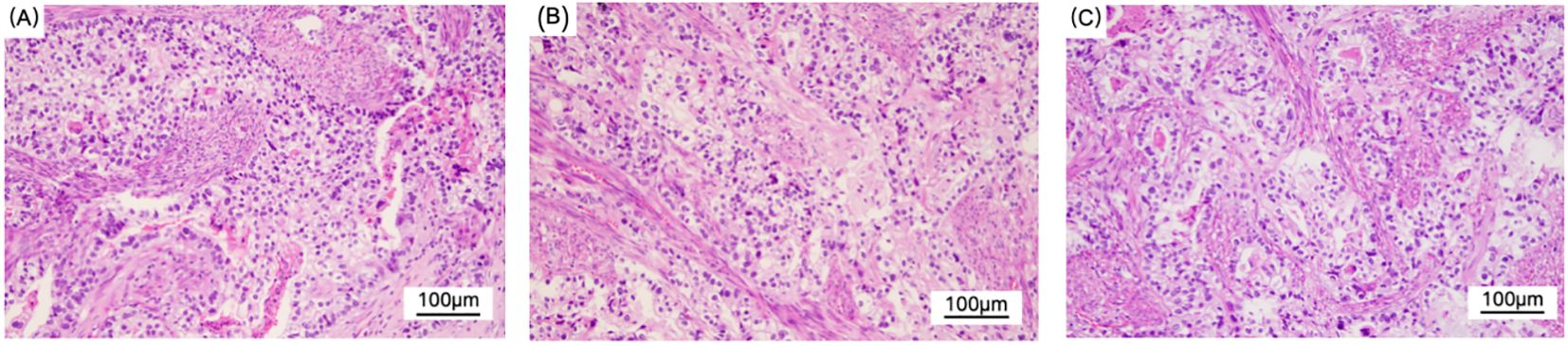 Figure 3. Figure (A–C) show the light microscopic appearance of YST. Hematoxylin and eosin (H&E), original magnification × 200.The main type is adenocarcinoma. Some tumor cells have clear cytoplasm, and nuclear/proximal nuclear vacuoles can be observed in figure (B). They are arranged in an adenoid or sieve-like pattern, and mitotic figures are common. Considering the morphology and immunohistochemical results, it is considered a mixed endometrial-like carcinoma. Some of the tumors are suspected to have differentiated into yolk sac tumors.