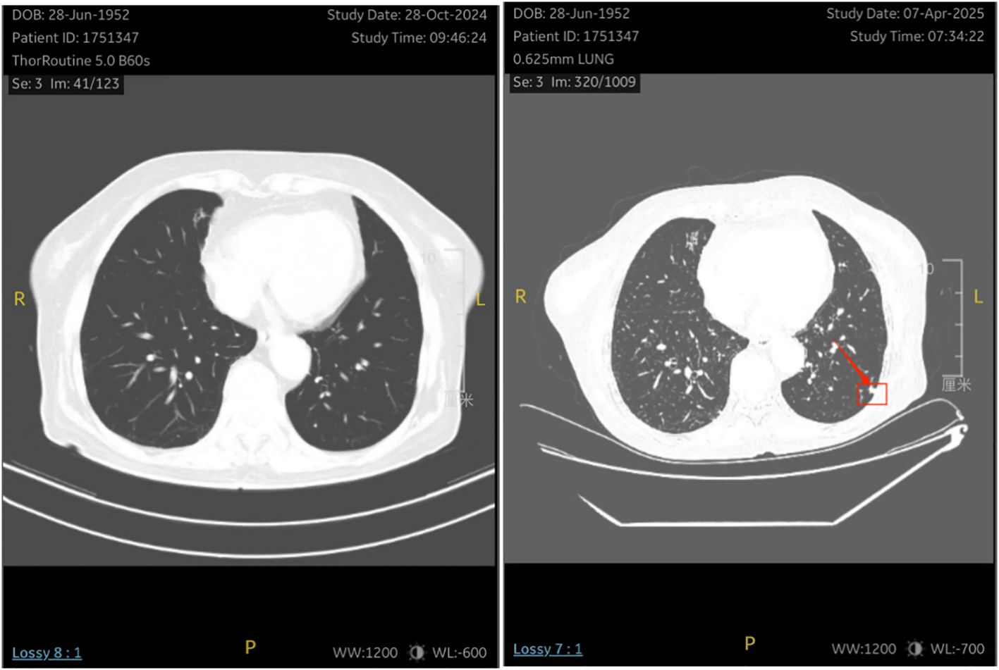 Figure 6. The patient underwent a re-examination of the chest CT on April 7, 2025, which revealed multiple small nodules in the lungs . It is considered that there might be metastatic tumors.