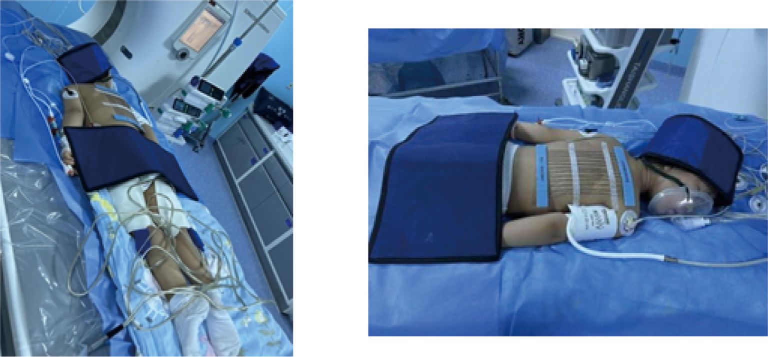 Figure 1. Preparation and radiological protection for ablating a pediatric hepatoblastoma under CT guidance and radiological protection.