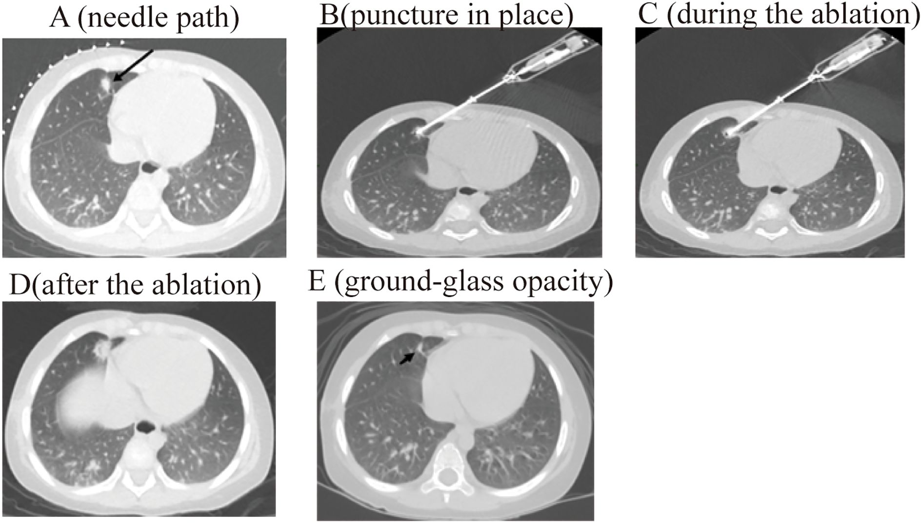 The procedure for CT-guided radiofrequency ablation of pulmonary metastases proceeds as follows: The patient, a child, undergoes non-intubation general anesthesia using either propofol or sufentanil. Based on the lesion’s location as identified in preoperative CT (RRID: MGI: 2162669) scans, the patient is positioned on the CT (RRID: MGI:2162669) table to ensure accurate monitoring via electrocardiogram, oxygen delivery, and precise placement of the ablation needle’s electrode to expose the surgical site, while providing radiation protection to non-targeted areas (Figure 1). Markers are placed on the surgical area for precise identification of the ablation site and planning of the needle’s trajectory (Figure 2A). The skin at the intended entry point is disinfected and covered with a sterile drape before inserting a disposable radiofrequency ablation needle (model: RFDJ01-141712010, Lead Electron Corporation, Mianyang, China) through the designated puncture site to the exact target location, ensuring that the needle’s active tip extends 1–5 times the tumor’s margin (Figure 2B). Local anesthesia with 2% lidocaine is administered prior to needle insertion. The radiofrequency ablator (Model: LDRF-120S, Lead Electron Corporation, Mianyang, China) is then connected and activated under controlled conditions, with settings adjusted to 15–30 watts for 2–3 minutes, depending on the lesion’s size. Post-ablation, CT(RRID: MGI:2162669) imaging reveals a ground-glass opacity encompassing the lesion, indicating complete coverage (Figure 2C). A final CT (RRID: MGI: 2162669) scan confirms successful ablation and checks for any complications like pneumothorax or bleeding (Figure 2D).