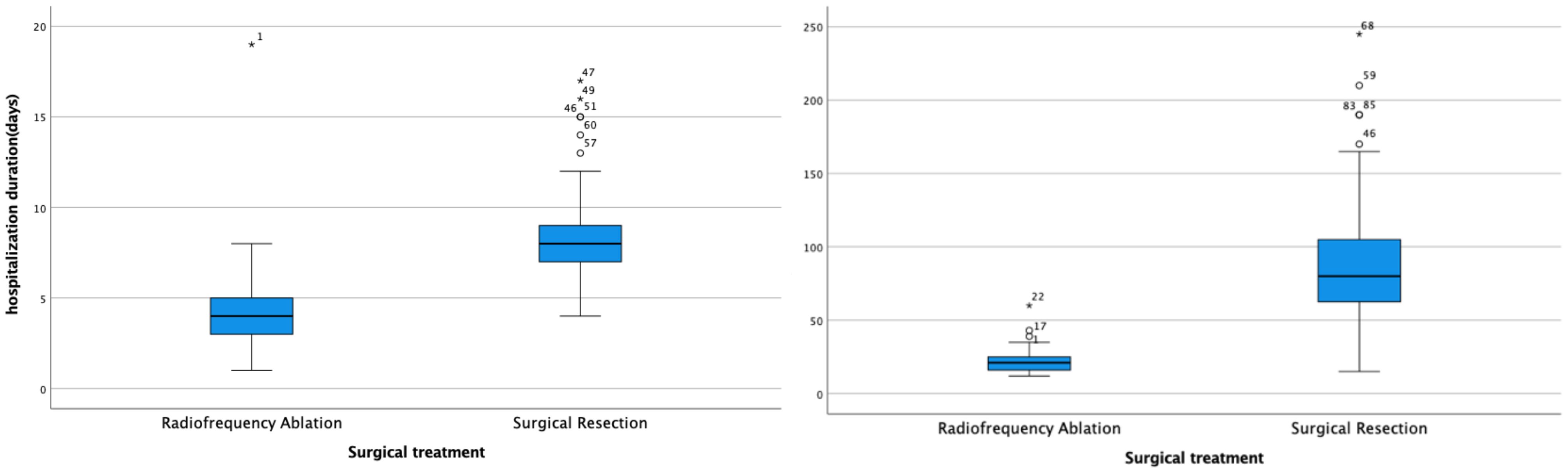 Children with HB (RRID: MGI:5784899) represent a demographic that does not generate income and can inevitably impose psychological and economic strains on their families due to the prolonged nature of treatment, potentially increasing the risk of treatment discontinuation. The analysis results of hospitalization duration and costs between the two groups revealed that the average hospital stay was 4 days at a cost of 21, 538 yuan for the radiofrequency ablation group, compared to 8 days and 26, 028 yuan for the surgical treatment group. This demonstrates that both the duration and costs of hospitalization for the radiofrequency ablation group were significantly lower than those for the surgical treatment group. Consequently, radiofrequency ablation emerges as a more efficient and cost-effective treatment option relative to surgical resection.