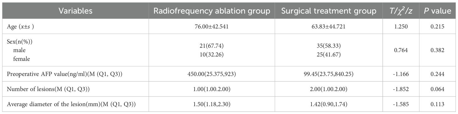 In the radiofrequency ablation group, there were 21 male cases and 10 female cases, with a male-to-female ratio of 2.1:1. In the surgical treatment group, there were 35 male cases and 25 female cases, resulting in a male-to-female ratio of 1.4:1; The ages in the radiofrequency ablation group ranged from 2 to 15 years, average (76.00 ± 42.541) months, while the surgical treatment group’s ages ranged from 1 year and 3 months to 21 years, with an average of (63.83 ± 44.721) months. Of the 91 patients, only 2 received bilateral treatment, while the remaining all underwent unilateral treatment. Statistical analysis showed that there were no statistically significant differences in gender, age, preoperative AFP (RRID: NSRRC_0028) levels, number of lesions, distribution of lesions and average lesion diameter between the two groups of patients (P>0.05), indicating good comparability (Table 1).