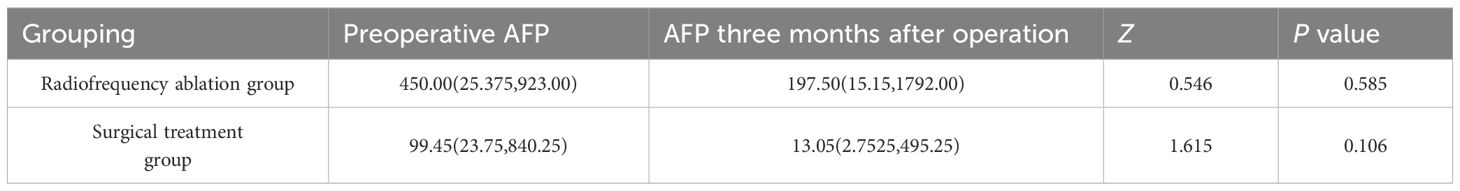 As shown in Table 2, the AFP (RRID: NSRRC_0028) levels in both the radiofrequency ablation group and the surgical treatment group decreased significantly after treatment. however, no statistically significant difference was observed (P>0.05).